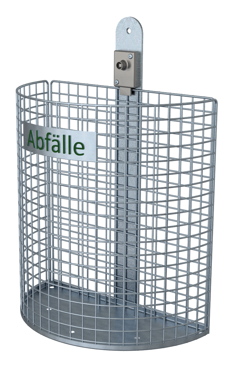 Abfallbehälter zur Wand- oder Pfostenbefestigung Abfallbehälter Nierenform Draht, Höhe ca. 430 mm, Inhalt ca. 27 L, Ø ca. 210 x 400 mm, komplett mit Befestigungsschiene und Vierkantschlüssel Art.-Nr. 4037, feuerverzinkt, ohne Standpfosten