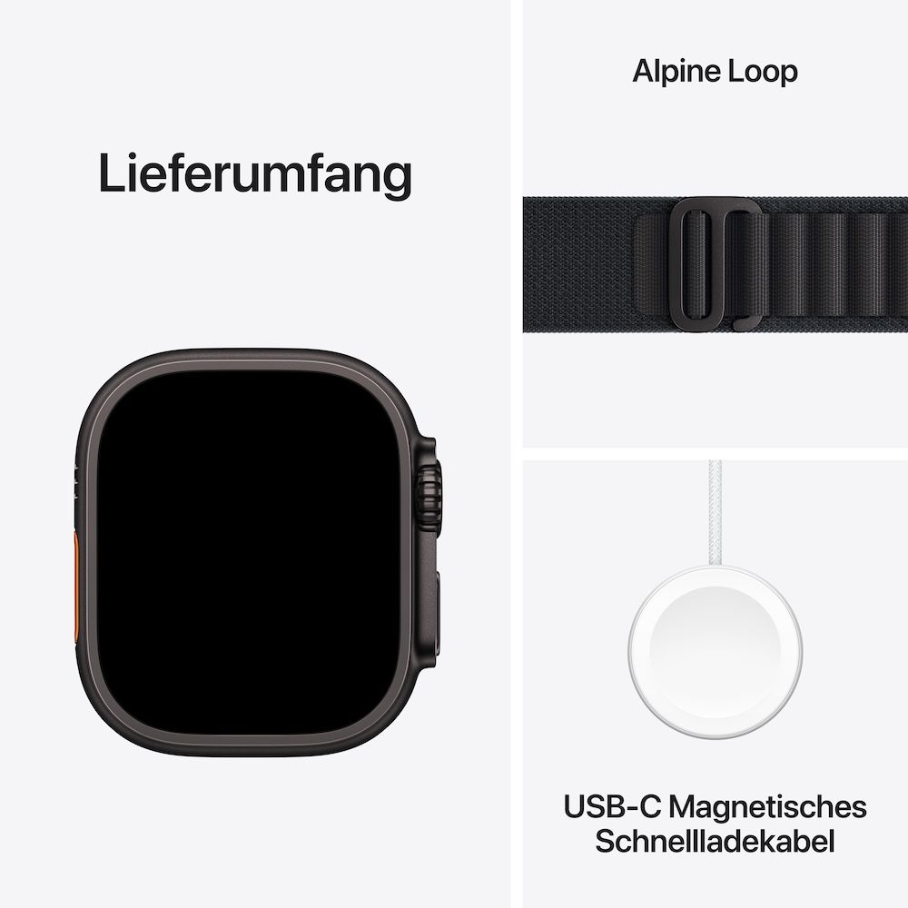 Die Apple Watch Ultra 3 ist ein echtes Multitaskingtalent, ob als Sportuhr oder als Smartwatch. Du kannst sie in einer Konferenz, beim Boxen, Tauchen oder bei einem Essen tragen und behältst immer alles im Blick. Nimm Anrufe entgegen, beantworte Nachrichten, streame Musik und bezahle einfach unterwegs. Gleichzeitig trackst du deine aktuellen Gesundheitsdaten und hast für alle Fälle hilfreiche Sicherheitsfeatures zur Hand. Nicht umsonst heißt sie Ultra.Non-Stop Ultra.Snowboarden, Skifahren, Mountainbiking, Rudern und mehr – mit der Ultra 3 findest du im App Store unzählige weitere Möglichkeiten, um die Sportarten und Aktivitäten, die du liebst, auf das nächste Level zu bringen. Schau rein. Hol das Maximum raus.| Armband: | Alpine Loop |