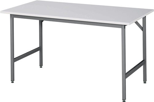 Untergestell aus Profilstahlrohr 30 x 30 mm mit integrierter Höhenverstellung · Querstreben oben (vorne und hinten) · Tragfähigkeit max. 300 kg bei gleichmäßig verteilter statischer Flächenlast · Melamin-Platte mit Melaminharz-Direktbeschichtung nach DIN 68765, bedingte Kratz- und Stoßfestigkeit · Stärke 22 mm · umweltfreundliche Pulverbeschichtung in anthrazitgrau, RAL 7016 · zerlegte Anlieferung, einfache Montage