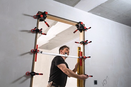aus Aluminium-Vierkantrohr (25 x 25 x 2,5 mm) · Teleskopauszug eloxiert · mit Maßskala · Ausleger aus glasfaserverstärktem Polyamid · Haltevorrichtung aus verzinktem Stahlblech · Sterngriffschraube aus Polyamid · mit Filzstreifen zum Schutz empfindlicher Oberflächen · Fixiert und stützt Türfutter beim Ausschäumen der Mauerfuge schonend und exakt· Teleskopierbares eloxiertes Aluminium-4-Kant-Rohr mit mm-Skala und Feststellschraube für maßgenaues Arbeiten· Kreuzförmige Druckplatte mit Filzschutz für empfindliche Türfutter mit einer Tiefe von 6 bis 13 cm bzw. 13 bis 30 cm· NEU: Umsteckbare Spannbügel mit vergrößerten Spannflächen und abnehmbaren Auslegern zum sicheren und einfachen Einsetzen des Türfutters