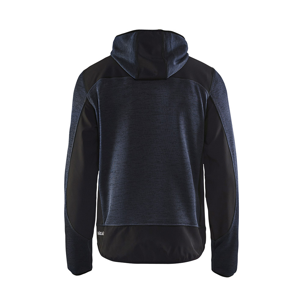 Die Blakläder Strick-Softshell-Jacke 49302117 in Marineblau bietet optimalen Schutz an kühlen und leicht regnerischen Tagen. Hergestellt aus 100% Polyester (380 g/m²), ist sie wind- und wasserabweisend dank PU-Beschichtung. Die Jacke hat verstärkte Schultern, einen Kinnschutz aus Fleece, sowie Brust- und Vordertaschen mit Reißverschlüssen. Ein verlängerter Rücken und Ärmelbündchen mit Gummizug sorgen für zusätzlichen Komfort.