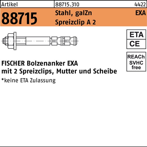 Eigenschaften "Bolzenanker R 88715 EXA 6/05 Stahl galv.verz./Spreizclip A2 100St. FISCHER"