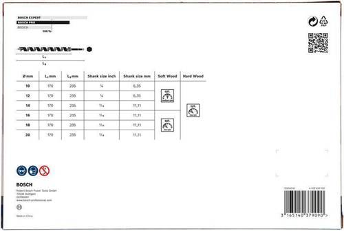 Eigenschaften "Bosch Schlangenbohrer-Set PRO Wood 6-tlg.D.10/12/14/16/18/20mm L.235mm 6KT "