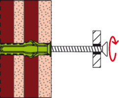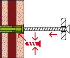 - Beim Setzen des Dübels klappen die Fixierflügel nach innen. Dadurch verrastet die Schraube beim Einstecken in den Dübel und kann somit nicht mehr herausfallen, was vor allem bei Überkopf Anwendungen sehr hilfreich ist.