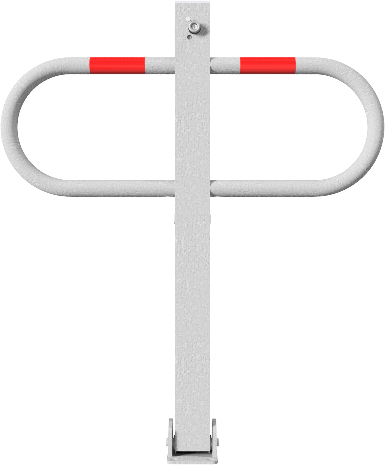 Durchgangs- und Parkplatzsperren, Vierkantrohr 70 x 70 mm, mit seitlichen Rundrohrbügeln, Gesamtbreite ca. 800 mm, Überflur 900 mm, umlegbar, mit Profilzylinderschloss drei Schlüssel, selbsteinrastende Verriegelung, für Dübelbefestigung, mit Bodenplatte oder zur Befestigung an Bodenhülse Typ 470.60, feuerverzinkt und weiß beschichtet mit rot reflektierenden Leuchtstreifen