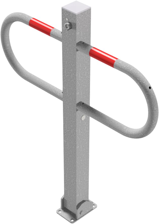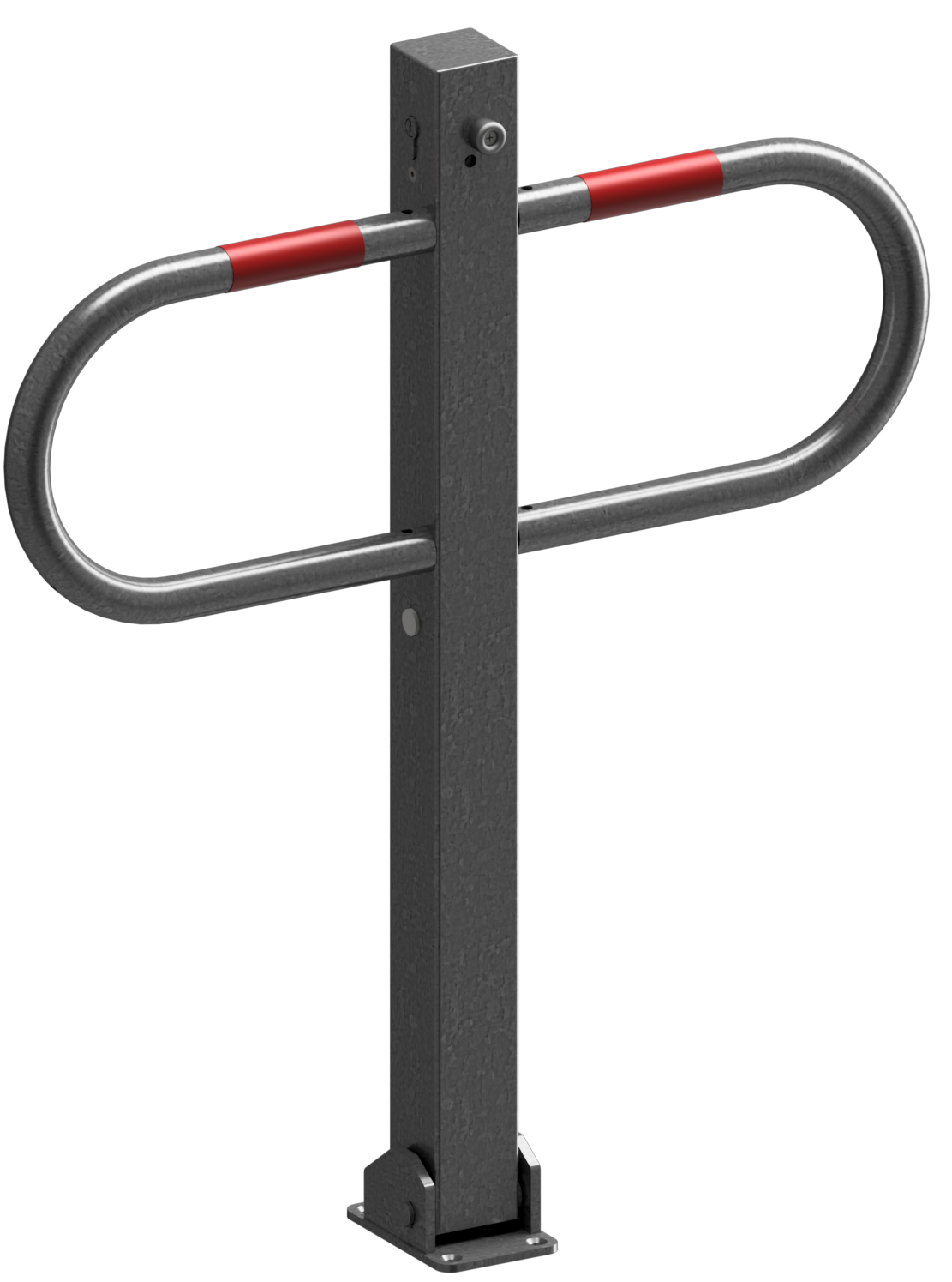 Durchgangs- und Parkplatzsperren, Vierkantrohr 70 x 70 mm, mit seitlichen Rundrohrbügeln, Gesamtbreite ca. 800 mm, Überflur 900 mm, umlegbar, mit Profilzylinderschloss drei Schlüssel, selbsteinrastende Verriegelung, für Dübelbefestigung, mit Bodenplatte oder zur Befestigung an Bodenhülse Typ 470.60, feuerverzinkt, mit rot reflektierenden Leuchtstreifen