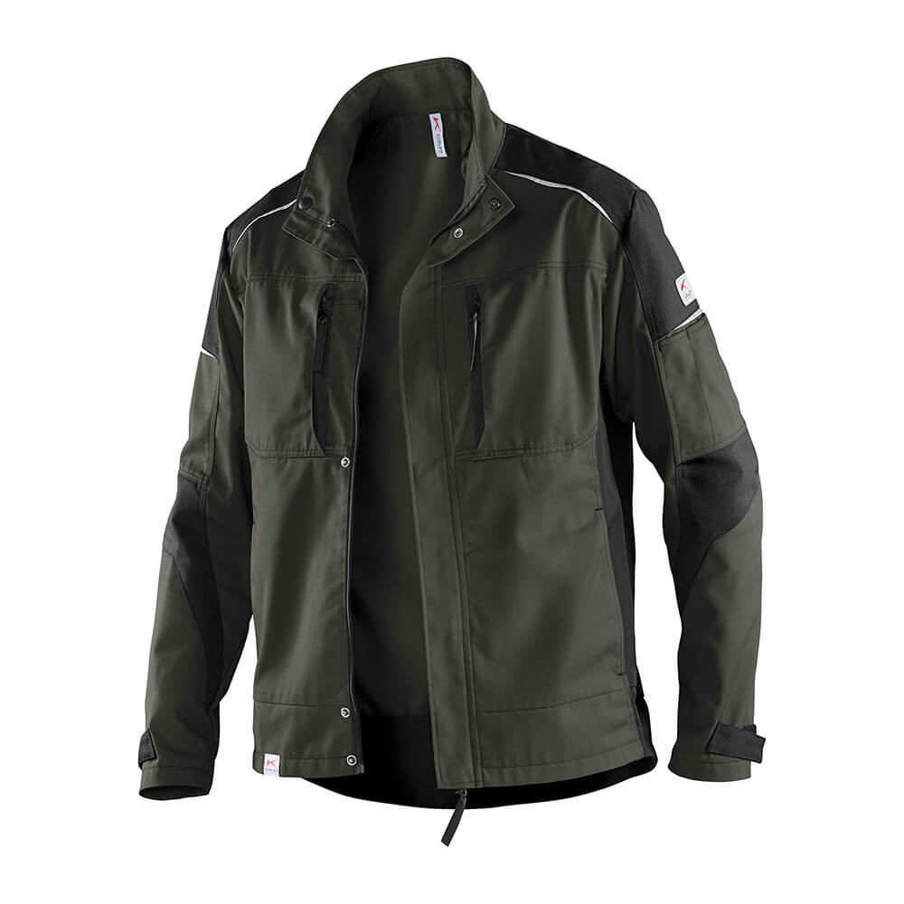 Arbeitsjacke mit körperbetontem Schnitt. Material: 65% Polyester/35% Baumwolle, 270 g/m². Produkteigenschaften: 2 Napoleontaschen, 2 Seitentaschen, Innentasche, Armtasche mit integrierter Stifttasche, abgedeckter Front-Reißverschluss mit Blende, Bart- und Kinnschoner, Steh-/Umlegekragen, Ärmelsaum weitenregulierbar. Kontrast-Elemente: Seiteneinsatz an Vorder- und Rückteil, Schulter- und Oberarmeinsatz, Ärmeleinsatz, Ärmelsaumverstellung. Reflex-Elemente: an vorderer und hinterer Schulter und Oberarmeinsatz.