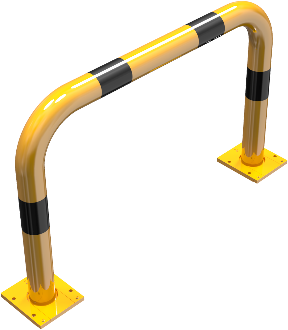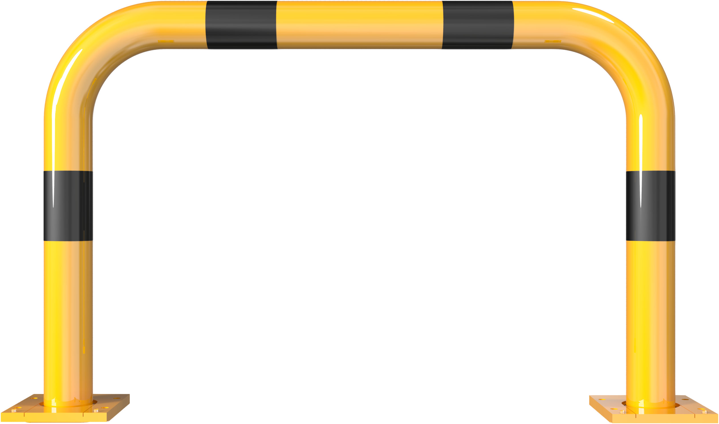 Rammschutzbügel, abnehmbar, mit Bodenplatten 160 x 180 mm, zum Aufdübeln, für vorübergehende Öffnung/Sperrung von Zugängen. Der Schutzbügel wird aus den aufgedübelten Bodenplatten entnommen und bei Bedarf wieder eingeschoben und mit Innensechskantschrauben verriegelt, Gesamtbreite: 1000 mm, Höhe Überflur: 650 mm, gelb pulverbeschichtet mit schwarzen Warnstreifen