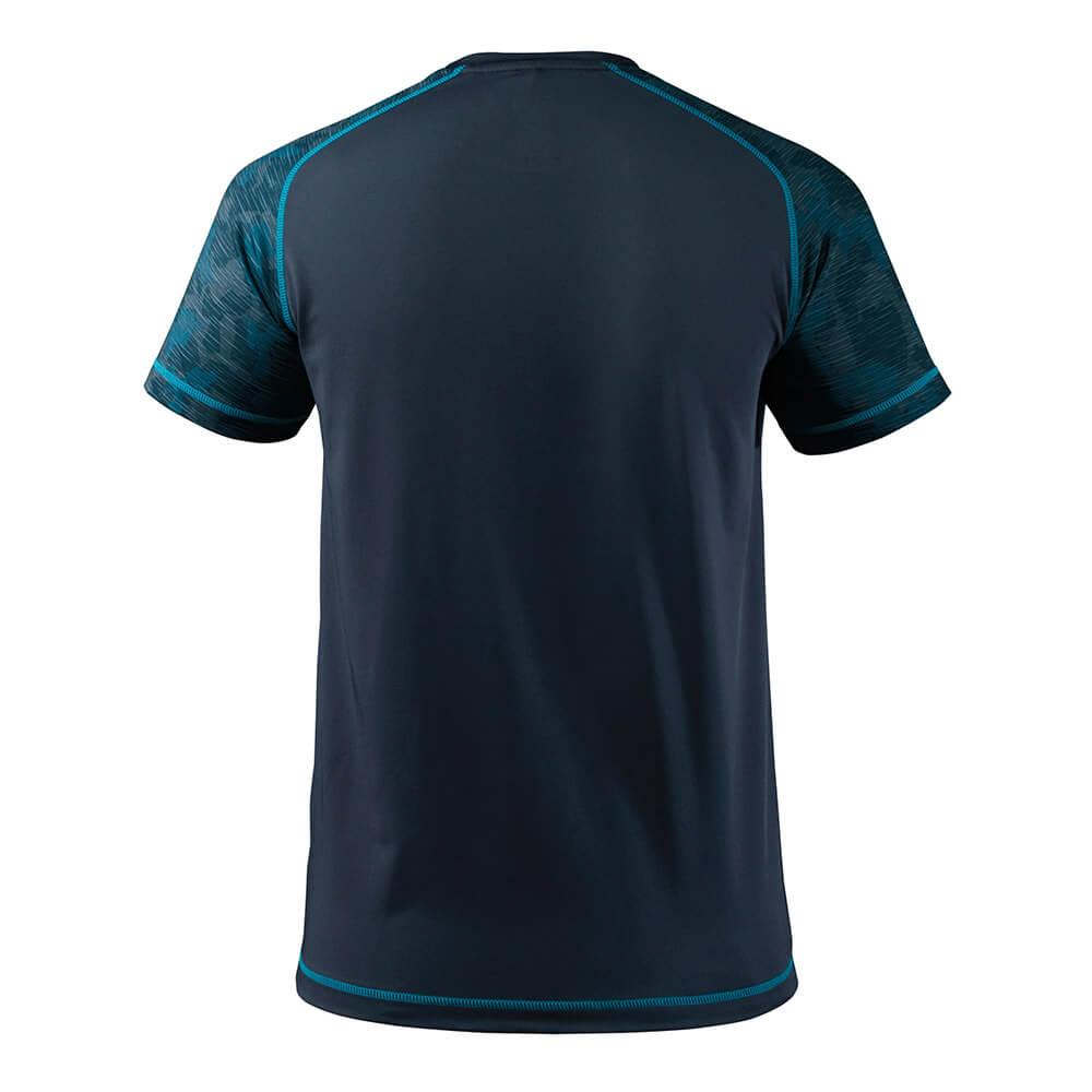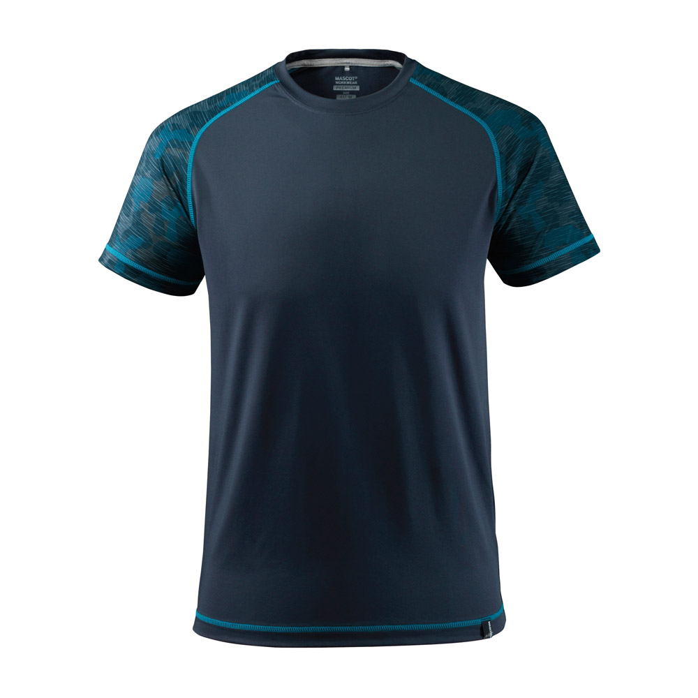Das MASCOT T-Shirt ADVANCED 17482 in schwarzblau aus der ADVANCED-Kollektion kombiniert modernes Design mit praktischen Eigenschaften. Hergestellt aus einem innovativen Single Jersey-Mischgewebe mit 8% Elasthan, bietet es hohe Flexibilität. Das Polyester ist feuchtigkeitstransportierend und schnell trocknend, zudem ist das Shirt antibakteriell vorbehandelt. Das modische Design und die körpernahe Passform machen es zu einem echten Blickfang. Es hat einen runden Halsausschnitt, ein Nackenband und Rippenbündchen am Hals.
