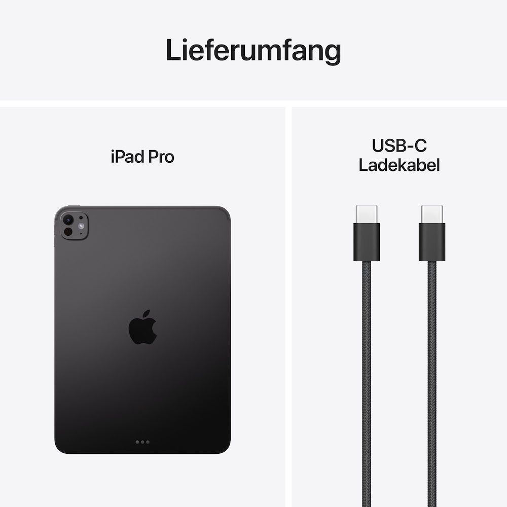 MMMMMaximale Power. Die Highlights. Der M5 Chip. Sensationell schnell. Der nächste Riesensprung für KI auf dem iPad. iPadOS 26. Ganz neu konzipiert. Mit Fähigkeiten, die alles verändern. Mit Apple Intelligence ist mehr möglich – von Bildkreation bis Live Übersetzung. Ultra Retina XDR. Das fortschrittlichste Display der Welt. Mit extremer Helligkeit und präzisem Kontrast. Elegantes, leichtes Design. Für ultimative Mobilität und Vielseitigkeit. Fortschrittliche Features und komfortables Tippen mit dem Magic Keyboard. Präzise Kreativität mit dem Apple Pencil Pro. M5. Schneller. Macher. Mit Leistung und Effizienz wie nie zuvor verschiebt der M5 Chip die Grenzen des Machbaren auf dem iPad Pro. Eine 10-Core GPU der nächsten Generation mit neuen Neural Accelerators sorgt für eine dramatisch beschleunigte KI Performance – von der Token-Generierung für große Sprachmodelle (LLM) bis zu generativer Bildgebung. Und die CPU Leistung mit mehreren Threads in Kombination mit schnellerem Arbeitsspeicher ermöglicht bahnbrechende Geschwindigkeiten für deine Workflows. Bis zu 6,7× schnellere Pro Rendering Performance mit Raytracing als beim iPad Pro mit M1. iPadOS und Apps. Produktivität beginnt mit Pro. iPadOS 26 bringt ein beeindruckendes neues Design mit Liquid Glass und grundlegende Verbesserungen, die die Produktivität des iPad Pro auf ein neues Niveau heben. Ein überarbeitetes, intuitives Fenstersystem gibt dir mehr Möglichkeiten und Flexibilität als je zuvor. Du kannst Pro Apps nutzen, anspruchsvolle Games spielen und kreative Projekte jeder Größe erledigen – alles per Touch. Produktivität auf dem nächsten Level. Öffne mehr Fenster auf einmal. Ändere ihre Größe oder ordne sie an, wie du willst. Und teile deinen Bildschirm in Drittel oder Viertel auf. Intensive Prozesse laufen im Hintergrund mit Hintergrundaktionen. Und über Live Aktivitäten verwaltest du alles, was gerade läuft. Du kannst Smart HDR Bilder und bis zu 4K ProRes Video aufnehmen und bearbeiten, größere 3D Szenen öffnen und editieren und komplexere KI Modelle ausführen, alles mit Pro Apps. Apple Intelligence. Macht viel. Verrät nichts. Das iPad Pro wurde für Apple Intelligence entwickelt. Zum Gestalten, Kommunizieren und Dinge leichter erledigen – und das mit bahnbrechendem Datenschutz.Mach einfach mehr – mit der Hilfe von Siri und ChatGPT. Entdecke weitere visuelle Stile in Image Playground, stell Fragen zu Fotos und Dokumenten und greif auf noch mehr Wissen zu.Beschleunige deine Workflows mit Kurzbefehlen und intelligenten Aktionen, die Text zusammenfassen, Bilder erstellen oder direkt auf Apple Intelligence Modelle zugreifen können. Mit Bereinigen kannst du ungewollte Details aus deinen Fotos entfernen. Markiere das Objekt einfach und entferne es mit einem Fingertipp – oder für noch mehr Präzision mit dem Apple Pencil. Apple Intelligence wurde entwickelt, um deine Privatsphäre bei jedem Schritt zu schützen. Es ist in deinem iPad Pro integriert und verarbeitet Anfragen direkt auf dem Gerät. So kennt Apple Intelligence deine persönlichen Daten, sammelt sie aber nicht. Und mit dem bahnbrechenden Private Cloud Compute kann Apple Intelligence auf größere serverbasierte Modelle zurückgreifen, die mit Apple Chips laufen. Damit werden komplexere Anfragen für dich bearbeitet, während deine Privatsphäre geschützt bleibt. Ultra Retina XDR. Das fortschrittlichste Display der Welt. Das Ultra Retina XDR Display kommt mit der alles verändernden Tandem OLED Technologie, die beeindruckende Helligkeit, präzisen Kontrast und extreme Performance im Dynamikbereich liefert. Fortschrittliche Technologien wie ProMotion und True Tone sorgen für ein nahezu atemberaubendes visuelles Erlebnis. Und der Referenzmodus bringt Farbgenauigkeit in deine Workflows. Ein Kraftpaket für überall. Trotz seiner extrem dünnen und leichten Form liefert das iPad Pro unglaubliche Leistung und Batterielaufzeit für den ganzen Tag – es definiert Produktivität damit völlig neu. Und mit Schnellladen kannst du es jetzt in etwa 30 Minuten auf bis zu 50 Prozent laden. Apple Pencil Pro. Entwickelt für Kreativität ohne Limits. Zeichnen, malen, per Hand schreiben und Notizen machen – der Apple Pencil setzt den Standard dafür, wie sich das anfühlen sollte: intuitiv, präzise und geradezu magisch. Mit pixelgenauer Präzision, niedriger Latenz, Neigungssensitivität und Unterstützung für Handflächenerkennung. Und der Apple Pencil Pro kann noch viel mehr, um deine Ideen umzusetzen. Magic Keyboard. Präzision per Fingertipp. Das Magic Keyboard hat ein elegantes, mobiles Design mit einer Handauflage aus Aluminium und bietet ein fantastisches Tipp- und Trackpad-Erlebnis. Die Tastatur verfügt über eine Reihe mit Funktionstasten und ein größeres Trackpad aus Glas mit haptischem Feedback für präzises Arbeiten und Multi-Touch Gesten. Mikros. Kameras. Action. Videos drehen, schneiden und teilen – alles auf dem gleichen Gerät. Kein Problem, wenn man ein Pro Kamera-System mit LiDAR Scanner, Mikrofone in Studioqualität und vier Lautsprecher hat. Nimm 4K ProRes Video oder einen Podcast auf und wähle mit der Eingabeauswahl das richtige Mikrofon für jede App. WLAN und Mobilfunk. Bleib verbunden. Ganz egal wo. Deine Projekte laufen überall flüssig, dank besserer Performance und Zuverlässigkeit mit WLAN 7, Bluetooth 6 und Thread – alles ermöglicht durch den neuen N1 Wireless Chip. Das C1X Mobilfunkmodem der zweiten Generation unterstützt schnellere Datenübertragungsraten bei höherer Effizienz und gewohnter, weltweiter 5G Abdeckung. So kannst du unterwegs sicher auf Dateien zugreifen, mit anderen zusammenarbeiten und Daten sichern.