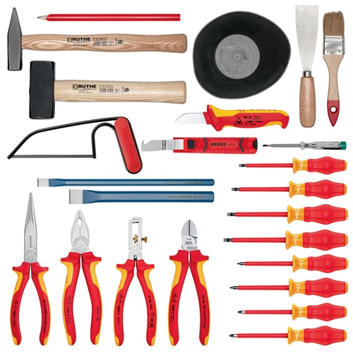 für die Elektroinstallation · bestückt mit Werkzeugen in Handwerker und Industriequalität Bestehend aus:1 Kombizange 180 mm VDE isoliert (Knipex)1 Flachrundzange mit Schneide 160 mm VDE isoliert (Knipex)1 Seitenschneider 160 mm VDE isoliert (Knipex)1 Abisolierzange 160 mm VDE isoliert (Knipex)1 Abmantelungswerkzeug 165 mm VDE isoliert Arbeitsbereich 8 - 28 mm Ø (Knipex)1 Kabelmesser 185 mm (Knipex)je 1 Schraubendreher für Schlitzschrauben Gr. 2,5 / 3,5 / 5,5 / 6,5 mm VDE isoliert (Wera)je 1 Schraubendreher für Schrauben mit Kreuzschlitz (PH) Gr. 1 / 2 VDE isoliert (Wera)je 1 Schraubendreher für Schrauben mit Kreuzschlitz (PZD) Gr. 1 / 2 VDE isoliert (Wera)1 einpoliger Spannungsprüfer 3,0 x 70 mm, Arbeitsbereich 150 - 250 V AC (Wera)1 Maurermeißel 250 mm (Rennsteig)1 Elektrikermeißel 250 x 10 mm (Rennsteig)1 Zimmermannsbleistift1 Gipsbecher konisch (90 / 125 mm Ø) (Picard)1 Flachpinsel 40 mm breit (Picard)1 Schlosserhammer 300 g (Picard)1 Fäustel 1000 g (Picard)1 Malerspachtel mit Holzheft Breite 40 mm (Maurer Freund)1 PUK®Kleinsägebogen Blattlänge 150 mm Schalenkoffer:max. Zuladung 20 kg, umlaufender Aluminiumrahmen, 2 Metall-Kippschlösser und ein 3-stelliges Zahlencodeschloss, integriertes Fahrgestell mit Teleskopgriff und leichtgängigen RollenAußenmaße: 515 x 430 x 280 mm (B x T x H)