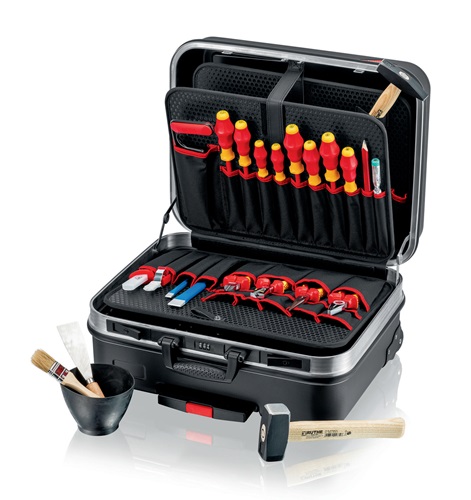 für die Elektroinstallation · bestückt mit Werkzeugen in Handwerker und Industriequalität Bestehend aus:1 Schaltschrankschlüssel (Knipex TwinKey®)1 Spitz-Kombizange 145 mm VDE isoliert (Knipex)1 Abisolierzange (Knipex MultiStrip 10)1 Elektro-Installationszange 200 mm VDE isoliert (Knipex)1 universal Abmantelungswerkzeug 135 mm, Arbeitsbereich 8 - 13 mm Ø (Knipex ErgoStrip®)1 Flachrundzange mit Schneide 200 mm VDE isoliert (Knipex)1 Seitenschneider 160 mm VDE isoliert (Knipex)1 Kraftseitenschneider 200 mm VDE isoliert (Knipex)1 Zangenschlüssel Länge 180 mm, max. Spannweite 35 mm (Knipex)1 Wasserpumpenzange 180 mm (Knipex Cobra®)1 selbsteinstellende Crimpzange für Aderendhülsen 180 mm (Knipex)1 Kabelmesser 185 mm VDE isoliert (Knipex) 1 Schraubendreher für Schrauben mit Kreuzschlitz (PZD) Gr. 1 VDE isoliert (Knipex)*1 Schraubendreher für Schlitzschrauben Gr. 3,5 mm VDE isoliert (Knipex)* 1 Wechselklingensatz 16-teilig, VDE isoliert (Wera)1 Steckschlüsselgarnitur 6,3 mm (1/4″) 28-teilig, (Wera Zyklop Metal 8100 SA 8)1 Doppelmaulschlüssel 10 x 13 mm (Wera Joker)1 Schlosserhammer 300 g1 Elektrikermeißel 250 x 10 mm (Rennsteig)1 Wasserwaage 30 cm aus Aluminium (Stabila)1 Mini-Wasserwaage 68 mm (Stabila Pocket Electric)* mit reduzierten Klingendurchmesser Schalenkoffer Big Twin Move Elektro:Gesamtbelastbarkeit max. 30 kg, umlaufender Aluminiumrahmen, 2 Metall-Kippschlösser und ein 3-stelliges Zahlencodeschloss, integriertes Fahrgestell mit Teleskopgriff und leichtgängigen RollenAußenmaße: 520 x 435 x 290 mm (B x T x H)