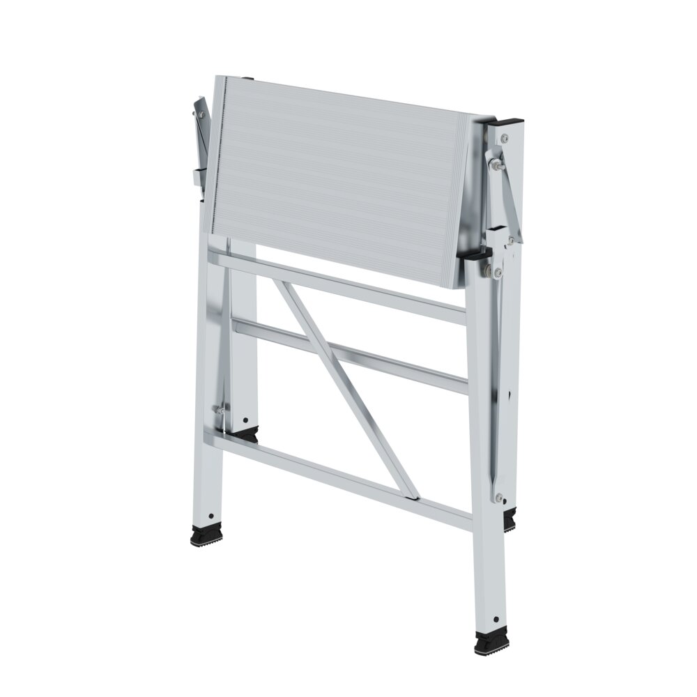 Klappbares Arbeitspodest aus Aluminium Stabile Rechteckrohr-Holme 80 mm tiefe · geriffelte Stufen Obere Trittfläche: 520 x 330 mm Beidseitige · starre Verbindung Leicht im Transport · platzsparend in der Aufbewahrung Rutschfeste Kunststoffschuhe Maximale Belastung: 150 kg
