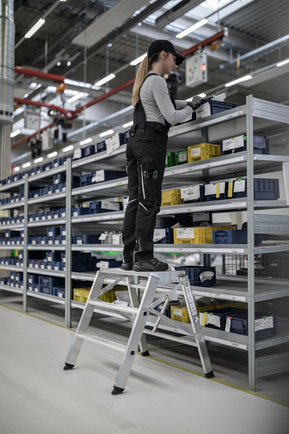 fahrbar · aus stabilem Aluminium, zusammenklappbar · durch die 4 Gleitrollen frei beweglich (360°) · Klapptritt senkt sich bei Belastung unverrückbar und bietet sicheren Stand · alle Kanten durch Kunststoffkappen geschützt · max. Gesamtbelastung 150 kg Weitere technische Eigenschaften: · Höhe geklappt: 500mm · Breite geklappt: 420mm · Tiefe geklappt: 200mm · prüfpflichtig: ja