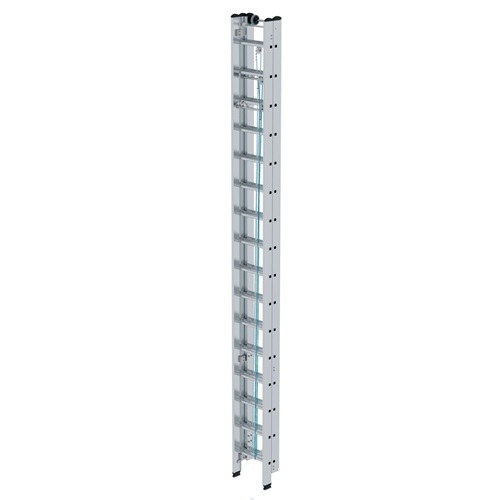 Sprossen-Seilzugleiter aus Aluminium Stabile Rechteckrohr-Holme Beidseitig geriffelte Vierkantsprossen 30 x 30 mm 4-fach gebördelte Sprossen-/Holmverbindung Bequeme Höhenverstellung von Sprosse zu Sprosse dank zwei Seilzügen mit Kunststoffseil Automatisch wirkende Einfallhaken · Mittel- und Oberteil separat verstellbar Oberleiter mit Wandlaufrollen Korrosionsbeständige Führungsbeschläge mit Gleitführungen Sprossenabstand: 280 mm Leiterbreite: 470 mm (ohne Traverse) Maximale Belastung: 150 kg nivello®-Leiterschuhe mit patentierter 2-Achsen-Neigungstechnik Hinweis: Anlegeleitern über 3,0 m dürfen nur dann ohne Traverse verwendet werden · wenn diese ausschließlich bestimmungsgemäß eingesetzt werden (z. B. fest eingebaut · mit Haken versehen · mit Gurt befestigt) Hinweis: Nach Norm ist das aufgesetzte Schiebeleiterteil bei Längen über 3,0 m nicht von der Leiter trennbar