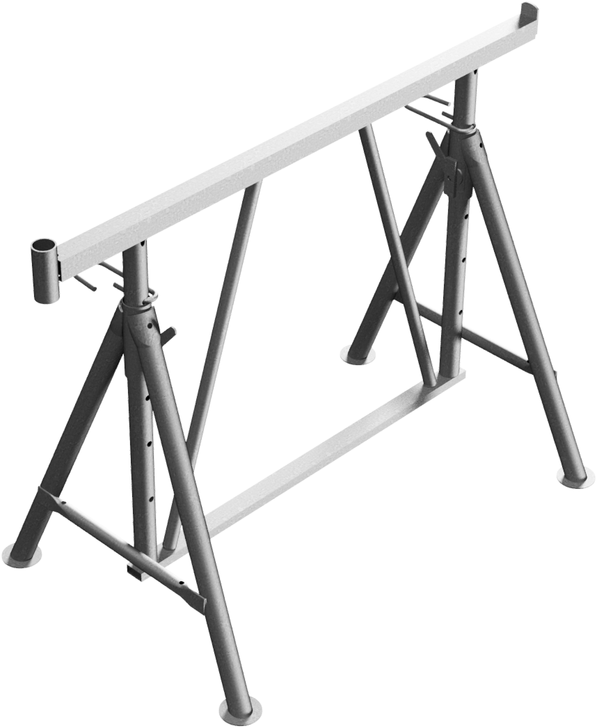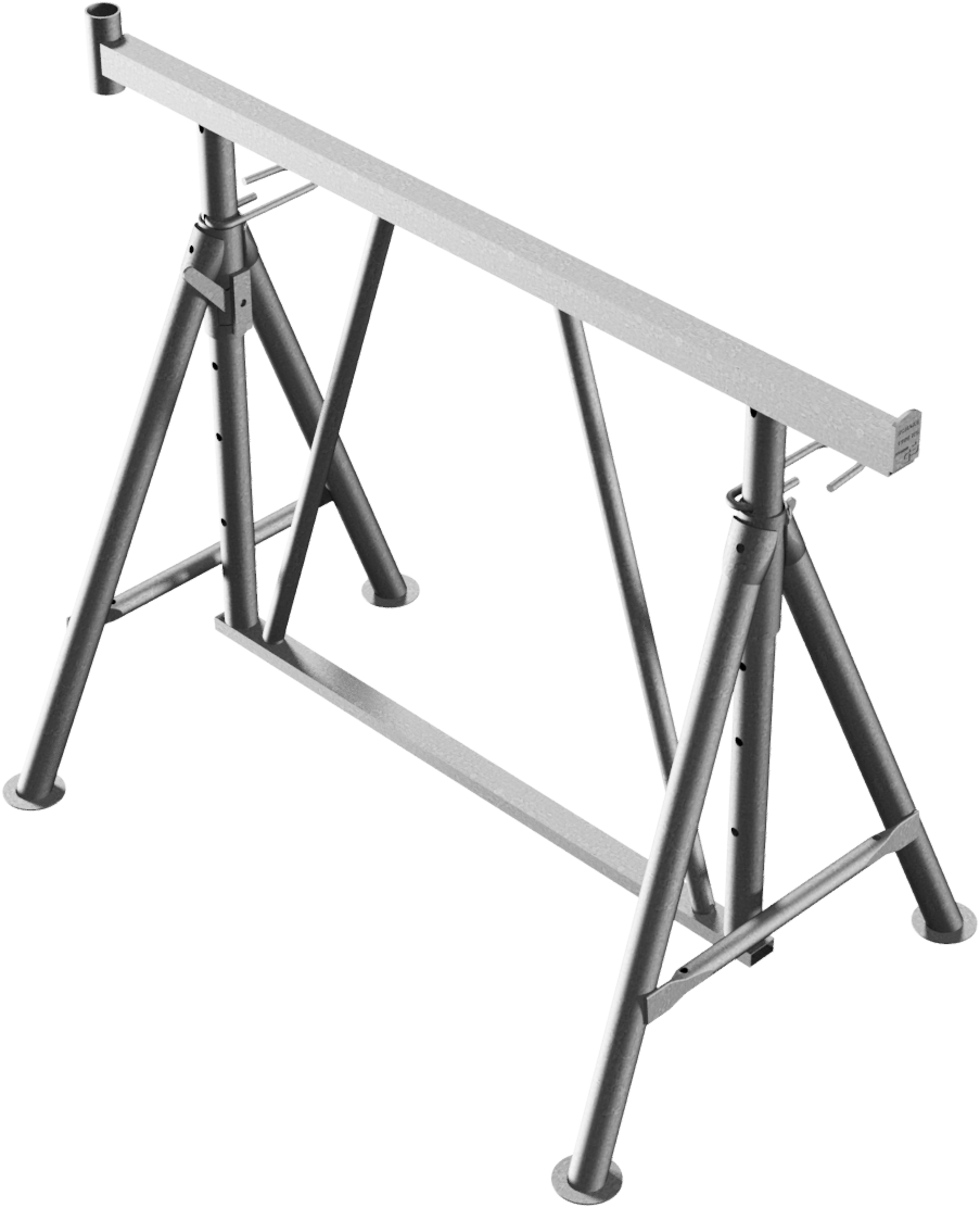 Faltgerüstbock „Compakt S 1200“ stabile Stahlkonstruktion mit Auflagetraverse aus 40 mm x 40 mm Vierkantrohr sowie seitlich angeschweißter Rohraufnahme für Geländerpfosten und Anti-Absturz Blech; beide Standfüße (aus Ø 42 mm Rundrohr) sind drehbar und besitzen jeweils 2 Grundplatten zur standfesten Positionierung auf jedem Untergrund; Obergestell mit Traverse ist ausziehbar und in mehreren Stufen, mittels eines unverlierbaren Hakens, einstellbar, Breite: 1,20 m, Tragkraft: 1500 kg, verzinkt, Gr. 1 Höhe: 0,75 m - 1,30 m