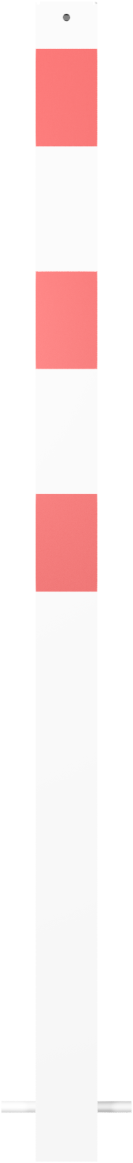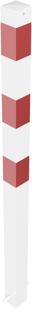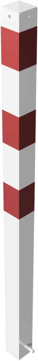 Absperrpfosten, Vierkantrohr 70 x 70 mm, mit Stahlkappe, 900 mm Überflur, herausnehmbar, mit Dreikantverschluss nach DIN 3223, oben innenliegend, selbsteinrastende Verriegelung, mit Bodenhülse Typ 470.10, ca. 500 mm Unterflur, feuerverzinkt und weiß beschichtet mit drei rot reflektierenden Leuchtstreifen, ohne Öse