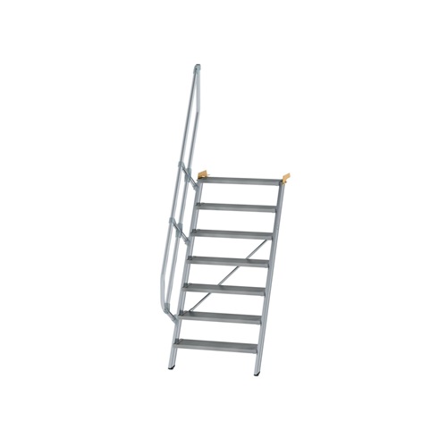 Ortsfeste Treppe aus Aluminium mit Neigung 60° Stufenbreite: 800 mm Stufentiefe: 225 mm Stufenausführung standardmäßig in Aluminium geriffelt (R 9) · optional auch mit anderen Belägen erhältlich Handlauf einseitig Ø 40 mm mit verschraubten Verbindungselementen serienmäßig (Höhe: 1.100 mm) Zweiter Handlauf nach DIN EN ISO 14122-3 erforderlich und gegen Mehrpreis erhältlich Bei Treppen mit senkrechter Höhe ab 3.000 mm ist ein Zwischenpodest erforderlich (gegen Mehrpreis) Einfache Montage durch Lieferung in vormontierten Baugruppen inklusive Montageanleitung Maximale Belastung: Stufenbelastung 150 kg · Gesamtbelastung 300 kg Hinweis: Im Standard sind Verbindungsteile aus verzinktem Stahl enthalten · welche für den Innenbereich geeignet sind. Gegen Mehrpreis können diese auch in Edelstahl ausgeführt werden · was für den Außenbereich empfohlen wird