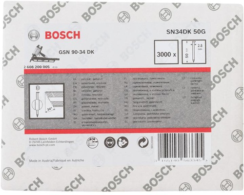 Eigenschaften "Bosch Streifennagel SN34DK 50G 3000-tlg.Schaft-D.2,8mm L.50mm D-Kopf verzinkt glatt"