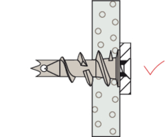 - Oberflächenbündige Montage in den Plattenbaustoff. Das Überdrehen des Dübels ist zu vermeiden. Deshalb ist bei Verwendung von Akkuschraubern das Eindrehmoment zu begrenzen.