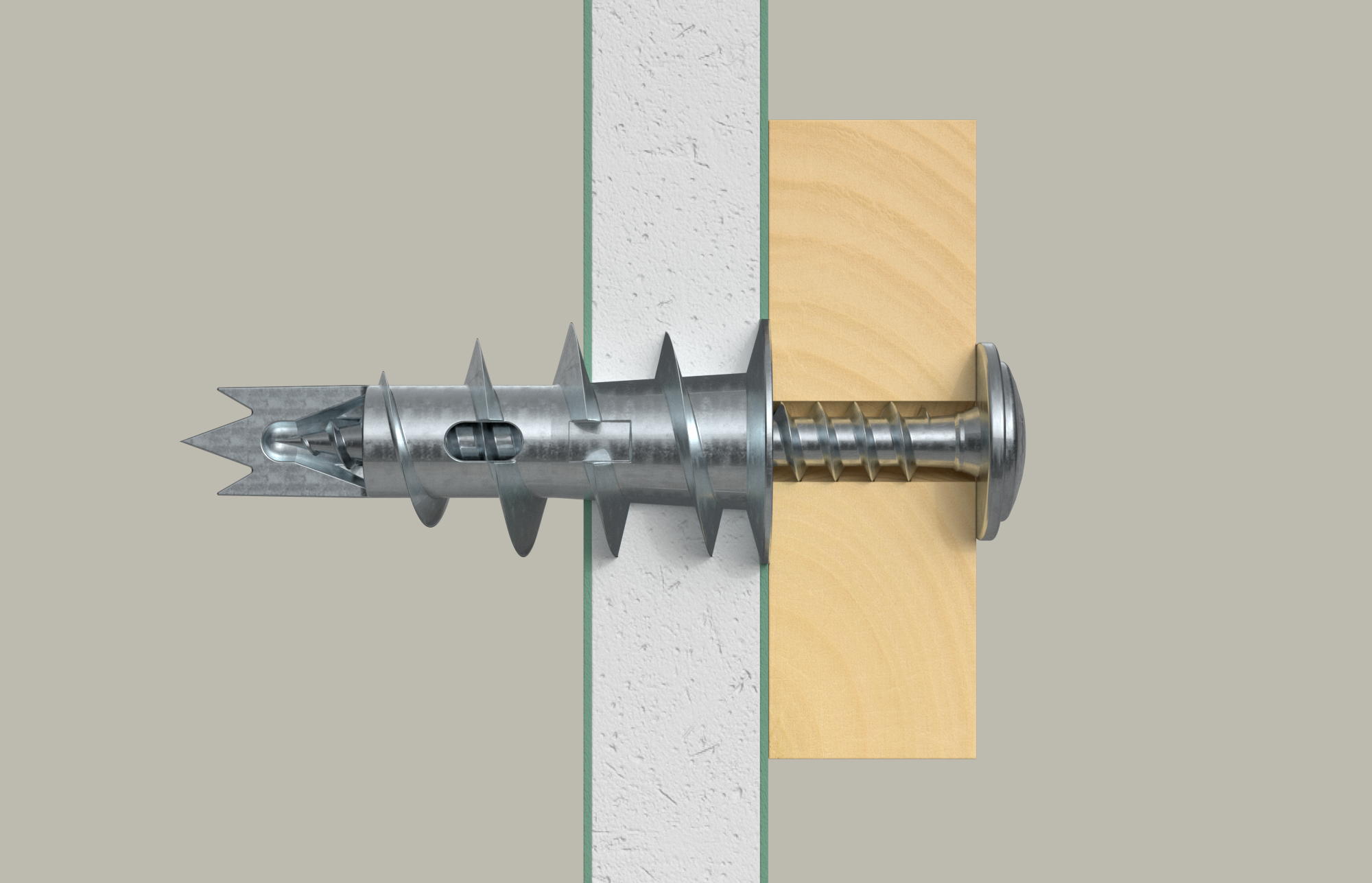 - Der selbstbohrende Metalldübel GKM schneidet sich formschlüssig in die Gipskartonplatte.