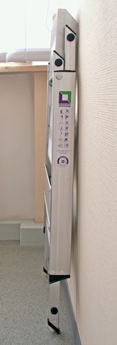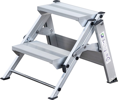 klappbar · hohe Standfestigkeit durch stabile Doppelholme · sicherer Stand durch besonders großflächige, trittsichere Stufen 205 mm tief, obere Trittfläche B 360 x T 205 mm · max. Gesamtbelastung 150 kg · rutschfeste Kunststoffschuhe · platzsparend in der Aufbewahrung Zusammengeklappt nur 85 mm tief.