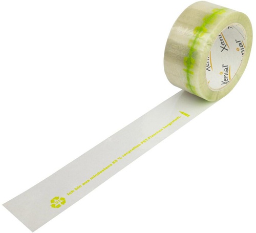 Umweltfreundliches Klebeband mit Aufdruck ″Ich bin aus mindestens 85 % recycelten PET-Flaschen hergestellt″ zeigt dem Empfänger · dass Sie umweltbewusst agieren! Niedriger CO2-Fußabdruck Zu mindestens 85 % aus recycelten PET-Flaschen hergestellt Recyclingfähig Kern aus recyceltem Papier Zuverlässiger und dauerhafter Verschluss für mittelschwere Kartonagen bis ca. 22 kg Weniger Rollenwechsel dank 100 lfm./Rolle Sehr gute Klebkraft Lösungsmittelfreier Hotmeltkleber Gute Feuchtigkeits- und Witterungsbeständigkeit Hitzebeständig kurzfristig bis ca. +170 °C Reißkraft: mind. 40 N/cm Klebkraft auf Stahl: mind. 5 N/cm EU-patentierte Qualität Weitere technische Eigenschaften: · Trägerart: pet · Klebmasse: hotmelt · Breite innen: 50mm · Länge innen: 100m · Material: Papier · Stärke: 37µ