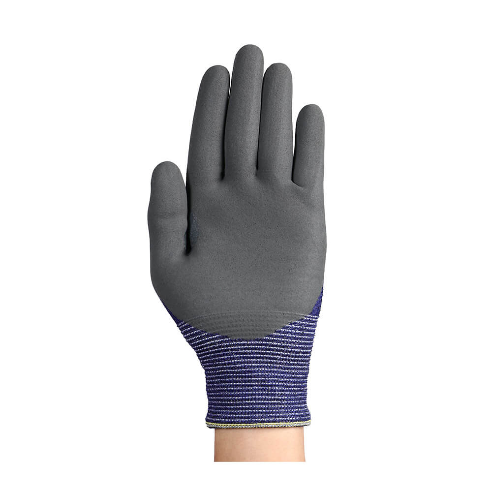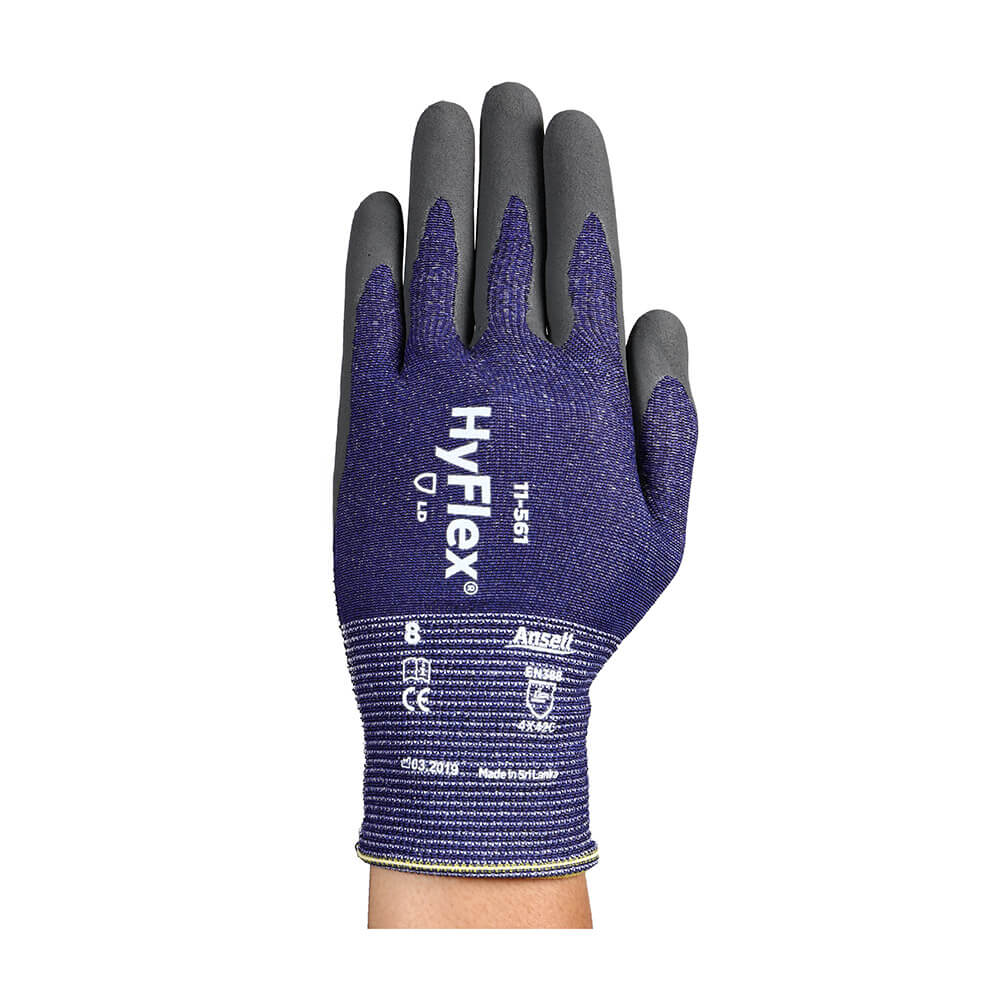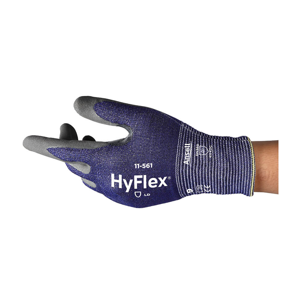 Der ANSELL Schnittschutzhandschuh HYFLEX 11-561 ist besonders feinfühlig und strapazierfähig dank seiner leichten, extrem dünnen Beschaffenheit und der Nitrilbeschichtung der ISO-Stufe C. Die verstärkte Daumenbeuge erhöht zusätzlich die Schutzleistung in den häufigsten Kontaktbereichen der Hand. Anwendungsgebiete umfassen Endmontage, Maschinen- und Gerätebedienung, Wartung, Erstmontage, Stanzen und Lagerarbeiten. Der Handschuh ist blau/grau und besteht aus Basalt, HPPE, Lycra, Nylon und Polyester, mit einer Innenhandbeschichtung aus Nitril. Er hat einen Strickbund, ist antistatisch, lebensmittelgeeignet und silikonfrei.
