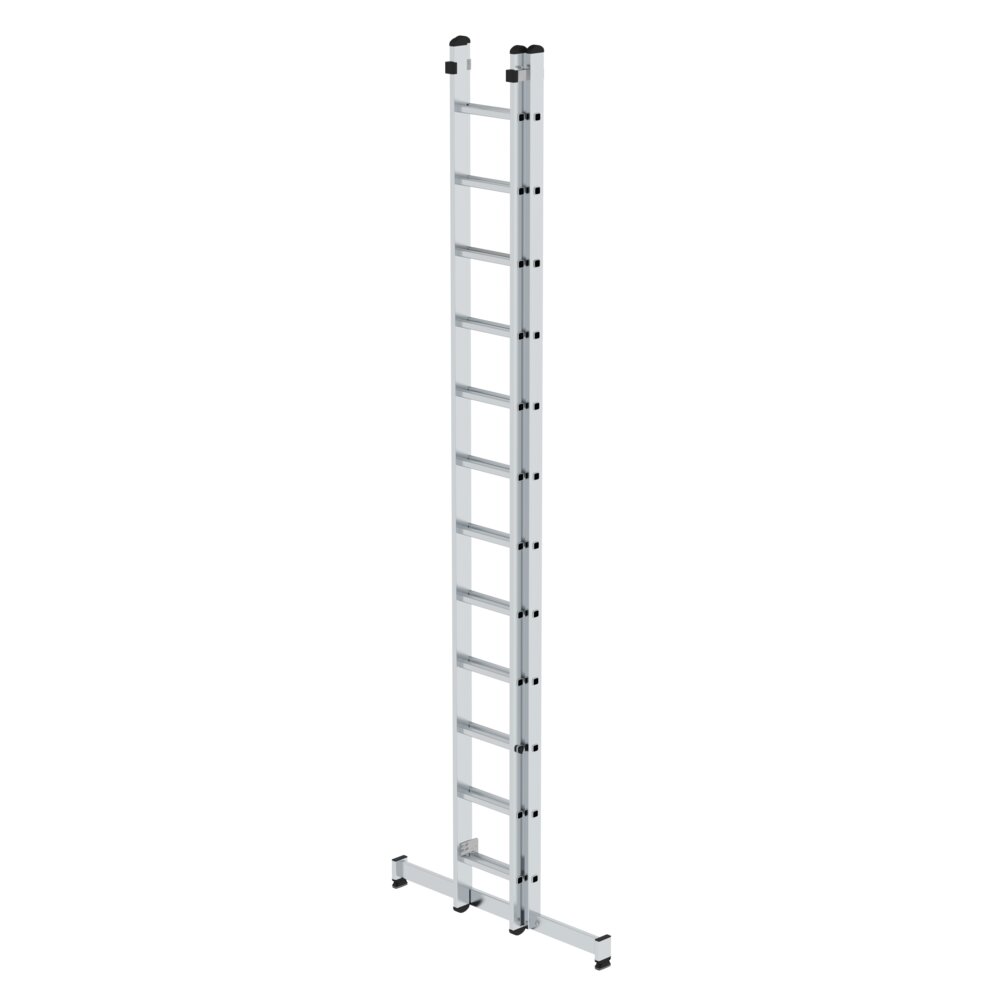 Aluminium · 2-teilig, mit breiter nivello®-Traverse · stabile Rechteckrohr-Holme · 30 x 30 mm Vierkantsprossen, beidseitig geriffelt · Sprossenabstand 280 mm · 4-fach gebördelte Sprossen-Holmverbindung · korrosionsbeständige Führungsbeschläge · Steckhaken mit automatisch einrastender Abhebesicherung · Höhenverstellung von Hand von Sprosse zu Sprosse · äußere Breite 420 mm · Traverse beidseitig mit rutschsicheren und flexiblen nivello®-Leiterschuhen, für optimale Bodenhaftung und sicheren Standab Ausführung 2 x 14 Sprosssen ist die Oberleiter mit Wandlaufrollen ausgestattet Die nivello®-Traverse liegt lose bei und wird zweifach am unteren Holmende verschraubt. Bei einer eingefahrenen Leiterlänge von über 3,0 m können die Leiternteile nicht mehr separat genutzt werden.