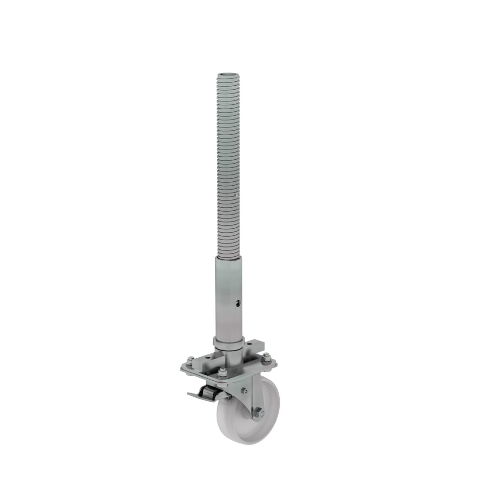 Mit Feststellbremse und Spindel zur Höhenverstellung (300 mm) Belastbarkeit bei Ø 125 mm bis 300 kg Belastbarkeit bei Ø 200 mm bis 500 kg Passend für unsere Fahrbalken Bestell-Nr. 27923 und Aufsteckrahmen von Gerüsten