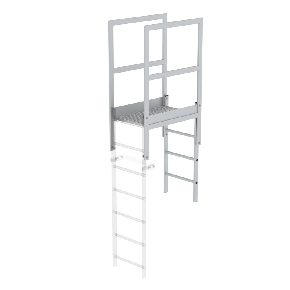 Mit Gitterrost Durchgangsbreite 536 mm · Sonderbreiten auf Anfrage Empfehlung für den Abschluss am Abstieg: Verstellbare Wandhalter oder Fußplatten Abstiegsleiter: Länge 1.220 mm · Ablängung bauseitig