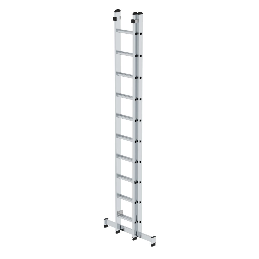 Zweiteilige Schiebeleiter für größere Höhen, mit kurzen Transport- und Lagermaßen. Sprossenweise manuelle Längeneinstellung durch Aufsetzhaken, Sicherung gegen Ausheben und Ausschieben beim Transport und in Gebrauchsstellung. Die TOPIC 1035 kann optional mit Kopffahrwerk ausgestattet werden.