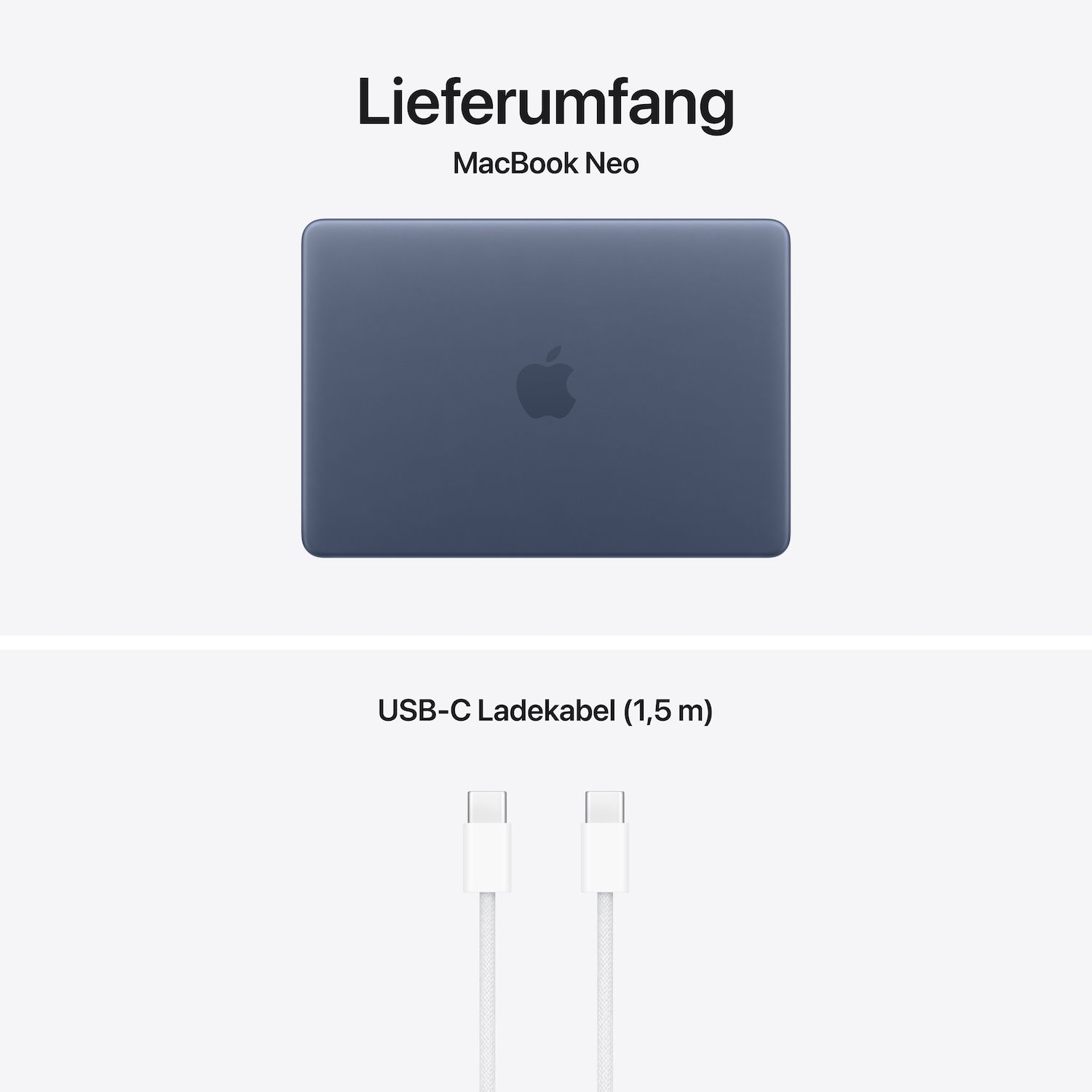Hallo, Neo. Die Highlights. Alles, was du machst, geht schneller. Mit bis zu 16 Stunden Batterielaufzeit. Und jetzt kommst du.13" Liquid Retina Display. Unglaublich brillant und hell. Eine. Milliarde. Farben. Klapp’s auf und sag Wow.Viel Power für KI und Apple Intelligence ist integriert. Richtig smart.Verbindet sich magisch mit deinem iPhone. Für noch mehr Features.macOS. Einfach zu verwenden. Und kompatibel mit deinen Lieblings­apps. Macht alles – sogar Spaß.Kostenlose Software Updates. Datenschutz, Sicherheit und Antivirus-Schutz integriert. Lehn dich zurück.</ul> Liebe auf den ersten Mac.Das neue MacBook Neo ist ein starker Mac zu einem smarten Preis. Mit einem robusten Design, tollen Farben und leistungsstarken Features – es ist eine neue Art, dich jeden Tag wieder in den Mac zu verlieben. Willkommen in der Familie. Sieh es dir genauer an. Robustes Design. Das MacBook Neo hat ein robustes Gehäuse aus recyceltem Aluminium. So erreicht es einen Recyclinganteil von 60 % nach Gewicht – den bisher höchsten in einem Apple Produkt. Display. Mit der heraus­ragenden Auflösung und einer Helligkeit von 500 Nits werden Fotos, Websites und Videos auf dem 13" Liquid Retina Display in erfrischender Klarheit und brillanten Farben lebendig. Tastatur und Trackpad. Das Magic Keyboard macht präzises Tippen besonders angenehm. Und auf dem großen Multi‑Touch Trackpad kannst du überall tippen, auf- und zuziehen, streichen und klicken. Touch ID. Beim Modell mit Touch ID kannst du dein MacBook Neo einfach per Fingertipp entsperren, dich bei Websites und Apps anmelden und Apps laden. Kamera. Mit der 1080p FaceTime HD Kamera bist du in Videoanrufen immer klar und deutlich zu sehen. Mikrofone und Lautsprecher. Zwei Side-Firing Lautsprecher liefern immersiven Sound. Und die Mikrofone isolieren und verstärken deine Stimme für einen kristallklaren Klang. Konnektivität. Mit zwei USB‑C Anschlüssen und einem Kopfhörer­anschluss kannst du Zubehör verbinden, Daten übertragen und dein MacBook Neo laden. Performance - Mach einfach,was du willst. Mit dem A18 Pro Chip ist so ziemlich alles möglich: Du kannst deine Lieblingsapps nutzen, tägliche Aufgaben schnell erledigen, kreativ sein und Action Games spielen. Was auch immer du vorhast – das MacBook Neo ist bereit für deine Ideen. Produktiv jeden Tag. E‑Mails schreiben, Videoanrufe annehmen, im Internet surfen, Kurspläne aktualisieren, Fotos teilen – mit dem MacBook Neo hast du deine To‑do-Liste immer im Griff. Ganz egal, ob du dich auf eine Prüfung vor­bereitest, mit Apple Intelligence deine Unterrichts­notizen zusammenfasst oder eine Präsentation erstellst – das MacBook Neo ist perfekt fürs Lernen. Produktiv jeden Tag. - E‑Mails schreiben, Videoanrufe annehmen, im Internet surfen, Kurspläne aktualisieren, Fotos teilen – mit dem MacBook Neo hast du deine To‑do-Liste immer im Griff. Meistere jedes Fach. - Ganz egal, ob du dich auf eine Prüfung vor­bereitest, mit Apple Intelligence deine Unterrichts­notizen zusammenfasst oder eine Präsentation erstellst – das MacBook Neo ist perfekt fürs Lernen. Arbeiten, ohne zu arbeiten.Von Tabellen­kalkulationen bis zur Lohn­abrechnung – das neue MacBook Neo erledigt Jobs mit Leichtigkeit. E‑Mails schreiben, Videoanrufe annehmen, im Internet surfen, Kurspläne aktualisieren, Fotos teilen – mit dem MacBook Neo hast du deine To‑do-Liste immer im Griff. Display mit extra viel Play. - Beeindruckende Grafik und ein brillantes Liquid Retina Display: Damit erlebst du Filme, Serien, Videos und Games unglaublich lebendig und detailreich.