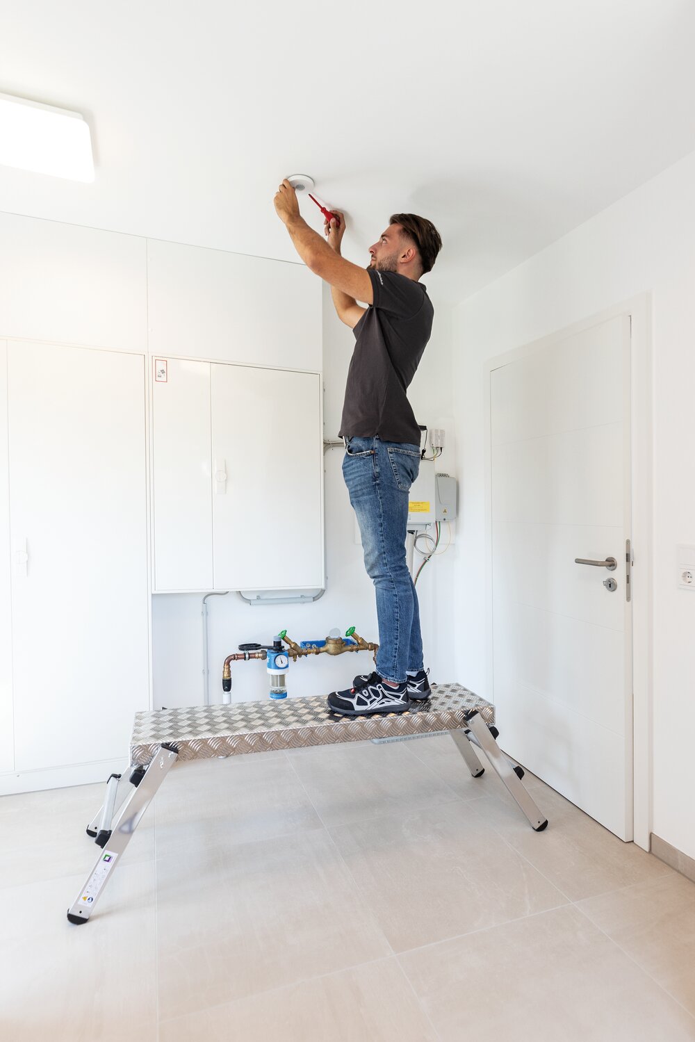 Stabile Aluminium-Konstruktion 2-fach klappbare Füße für drei verschiedene Arbeitshöhen (2,25 m/2,50 m/2,75 m) 65 mm tiefe · geriffelte Stufen für den sicheren Auf- und Abstieg Sicheres und bequemes Arbeiten auf geräumiger Standfläche (1,70 x 0,60 m) Trittsichere Oberfläche durch Siebdruckplatte Ausreichend Platz für zwei Personen plus Material Leicht im Transport · platzsparend in der Aufbewahrung Rollen für ein leichtes Verfahren von Ort zu Ort Rutschfeste Kunststoffschuhe Maximale Belastung: 300 kg