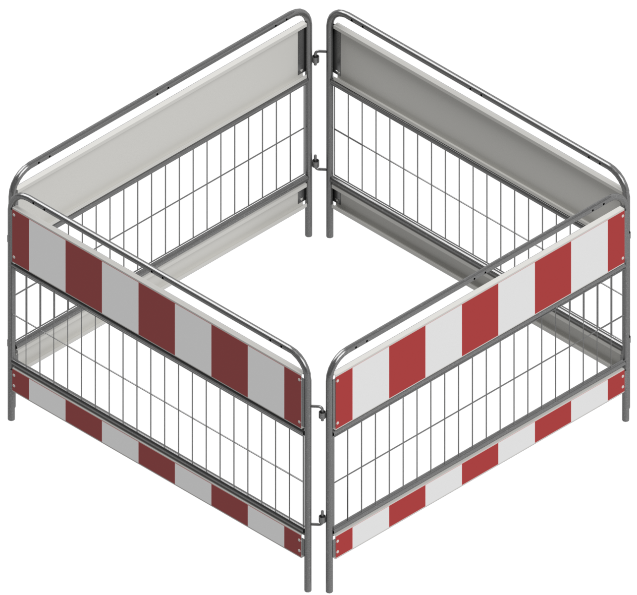 Schachtschutzgitter nach TL, geeignet zum Sichern von Gräben und anderen Baustellenbereichen, verzinktes Stahlgestell aus Rohrrahmen, aus Ø 26,9 mm Rundrohren gefertigt, zwischen den Rohren ist ein Gittergewebe eingeschweißt, mit eingenieteter Schranke (Höhe: 250 mm) und eingenieteter Tastleiste (Höhe: 100 mm) mit reflektierender rot/weißer Folie Typ 1 beklebt, Gesamthöhe: 1,00 m, jeweils 1 Element besteht aus 2 zusammenklappbaren Gittern, die drehbar, aber fest miteinander verbunden sind, durch Hinzufügen von weiteren Elementen kann das Gitter unbegrenzt vergrößert werden, 1 Element (Teil) besteht aus zwei zusammenklappbaren Gittern, mit zwei Scharnieren verbunden, 1,60 m x 1,60 m, 2-teilig