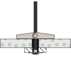 - Die Tragelemente der Kipp- und Federklappdübel klappen nach dem Einbringen ins Bohrloch hinter der Platte selbstständig auf.