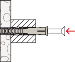 Der fischer Gipskartondübel GK ist aus hochwertigem Nylon gefertigt. Der Dübel wird in der Vorsteckmontage mit dem beigefügten Setzwerkzeug mit einem Akku-Schrauber oberflächenbündig in Gipskartonplatten eingedreht. Bis 15 mm Plattenstärke ist kein Vorbohren notwendig. Der fischer GK kann Holz-, Blech- und Spanplattenschrauben von 4 bis 5 mm Stärke sowie unterschiedliche Haken und Ösen aufnehmen. Dadurch ist er universell geeignet, um Bilder, Leuchten und Elektroinstallationen sicher und schnell zu befestigen.Einfache und schnelle Montage dank Setzwerkzeug.Hohe Tragfähigkeit durch formschlüssige Befestigung.Geringer Platzbedarf hinter der Platte dank kurzer Dübellänge.Optimal für Serienmontage.Durch den Kreuzschlitz im Dübelkopf lässt sich der GK auch ohne Setzwerkzeug wie eine Schraube demontieren.G9Das beigepackte Setzwerkzeug vereint die Funktionen Bohren und Dübel setzen. Es ermöglicht somit eine einfache und schnelle Montage.Das scharfe, selbstschneidende Gewinde des GK ermöglicht eine sichere, formschlüssige Befestigung. Dadurch wird eine hohe Tragfähigkeit erreicht.Durch die kurze Dübellänge wird nur ein geringer Platzbedarf hinter der Platte benötigt. Somit ist der GK auch bei unbekannter Plattendicke und Hohlraumtiefe einsetzbar.Durch den Kreuzschlitz im Dübelkopf lässt sich der GK auch ohne Eindrehwerkzeug wie eine Schraube demontieren.Der GK kann mit unterschiedlichsten Schrauben, Haken und Ösen verwendet werden. Dies eröffnet ein breites Anwendungsgebiet.Der Gipskartondübel GK ist geeignet für die Vorsteckmontage.Der GK wird mit dem beigefügten Setzwerkzeug oberflächenbündig in die Gipskartonplatte eingedreht. Das Überdrehen des Dübels ist zu vermeiden. Deshalb ist bei Verwendung von Akkuschraubern das Eindrehmoment zu begrenzen.Abgestimmt auf Holz-, Blech- und Spanplattenschrauben von ø 4,0 bis 5,0 mm.Ab 15 mm Plattendicke mit dem Setzwerkzeug vorbohren.Nicht geeignet für Gipsfaserplatten sowie geflieste Gipskartonplatten.geeignet fürGipskartonplatten, einfach und doppelt beplanktAnwendungBilderLeuchtenElektroinstallationenEinrichtungsaccessoiresSerienmontagen