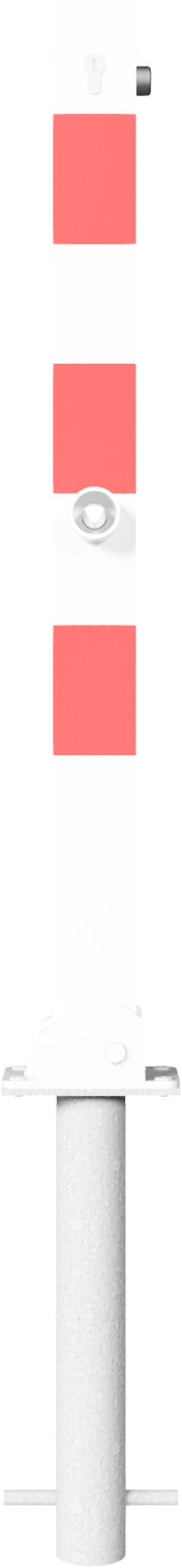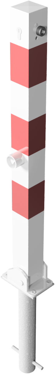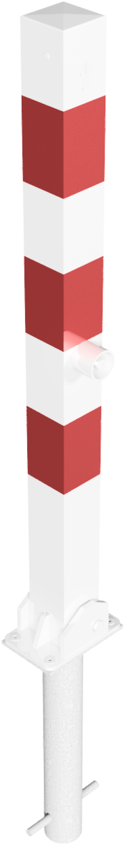Absperrpfosten, Vierkantrohr 70 x 70 mm, mit Stahlkappe, 900 mm Überflur, herausnehmbar, mit Dreikantverschluss nach DIN 3223, oben innenliegend, selbsteinrastende Verriegelung, mit Bodenhülse Typ 470.10, ca. 500 mm Unterflur, feuerverzinkt und weiß beschichtet mit drei rot reflektierenden Leuchtstreifen, ohne Öse