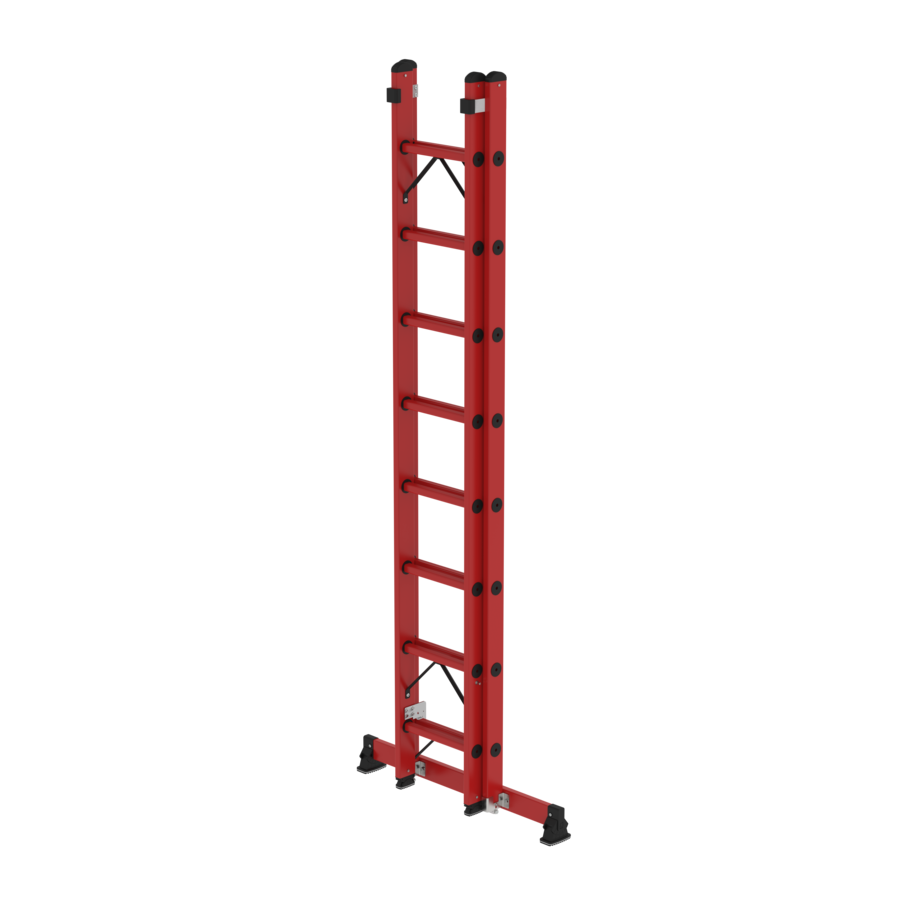 Holme aus glasfaserverstärkten Rechteckrohr-Profilen (mind. 10 Jahre Alterungsbeständigkeit) Beidseitig geriffelte Vierkantsprossen 28 x 29 mm Durch Verwendung des Einhängetritte aus Metall reduziert sich die Isolationsspannung auf 1.000 V Hochfeste Sprossen-/Holmverbindung Beschläge Stahl verzinkt Einfache Höhenverstellung von Sprosse zu Sprosse Oberleiter ab Größe 2 x 12 mit Wandlaufrollen