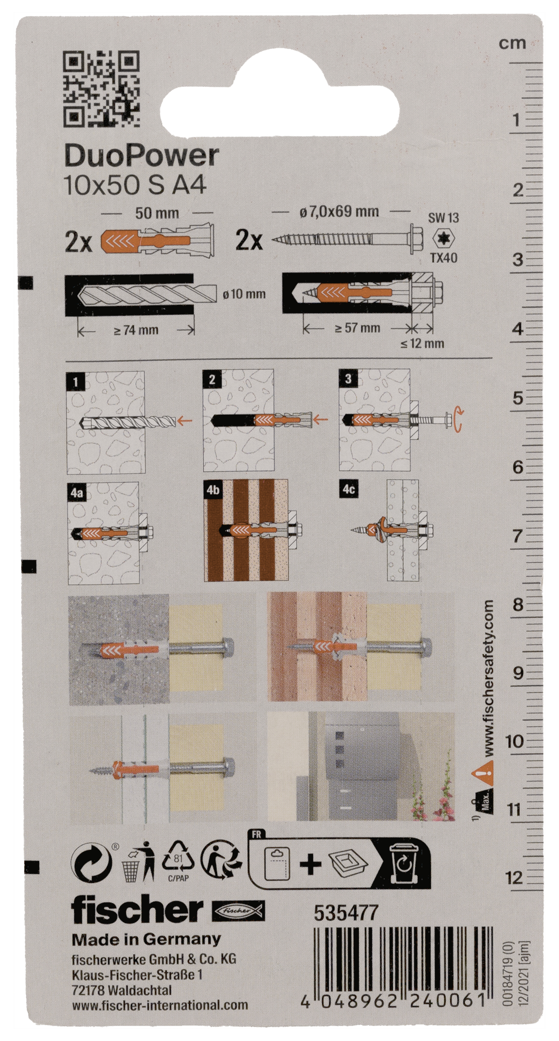 | Inhalt: | 2 x DuoPower 10 x 50 - 2 x Sechskant-Sicherheitsschraube 7,0 x 69 R rostfrei |