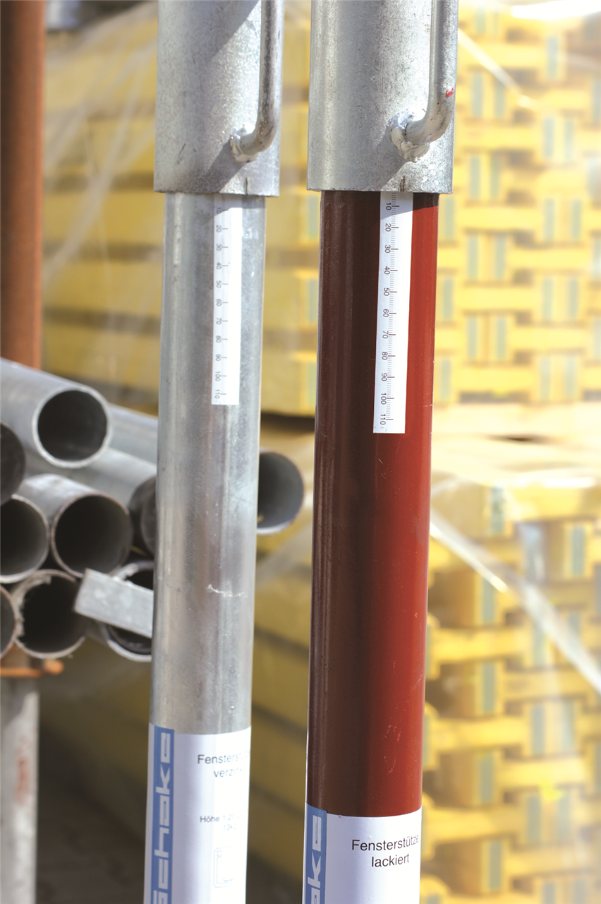 Euro Schalungsstütze der Klasse B/D, die bewährte Deckenstütze für den klassischen Hochbau, mit Handquetschsicherung und Ausfallsicherung. Unsere Euro-Schalungsstützen entsprechen den aktuellen Anforderungen des gültigen Regelwerks DIN EN 1065 für "freie" Baustützen. Durch einen an der Stütze aufgebrachten Aufkleber kann der Verstellbereich im Stützenschloss gut eingesehen werden, die zulässigen Tragkräfte sind abhängig von den Auszugslängen der Schalungsstütze, lackiert, mit Innengewinde, B/D25 Auszugslänge: 1,54m-2,50m
