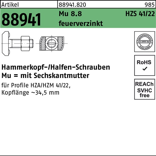 Artikel 88941 Mu 8.8 HZS 41/22 feuerverzinkt Hammerkopf-/Halfen-Schrauben · mit Sechskantmutter - Abmessung: M 12 x 50 VE=S (100 Stück) Weitere technische Eigenschaften: · Form: HZS 41/22 · Gruppencode: 88941.820 · Norm: REYHER-Artikel 88941 · Oberfläche: feuerverzinkt · Produkt-Typbezeichnung: Hammerkopf-/Halfen-Schrauben Mu = mit Sechskantmutter