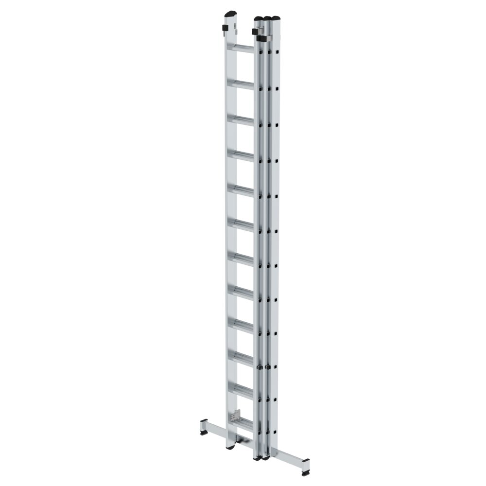 Sprossen-Schiebeleiter aus Aluminium Stabile Rechteckrohr-Holme Beidseitig geriffelte Vierkantsprossen 30 x 30 mm 4-fach gebördelte Sprossen-/Holmverbindung Einfache Höhenverstellung von Sprosse zu Sprosse dank Steckhaken mit automatisch einrastender Abhebesicherung Oberleiter ab Größe 2 x 14 Sprossen mit Wandlaufrollen Korrosionsbeständige Führungsbeschläge Mittel- und Oberleitern bis 3,0 m mit nivello®-Leiterschuhen Sprossenabstand: 280 mm Leiterbreite: 500 mm (ohne Traverse) Maximale Belastung: 150 kg nivello®-Traverse in optimaler Breite zum gewählten Produkt für einen extra sicheren Stand und Aufstieg dank nivello®-Leiterschuhe mit 2-Achsen-Neigungstechnik · Anstellwinkel-Kontrolle und wechselbaren Fußplatten. Die Traverse liegt lose bei und wird zweifach am unteren Holmende verschraubt Hinweis: Nach Norm ist das aufgesetzte Schiebeleiterteil bei Längen über 3,0 m nicht von der Leiter trennbar