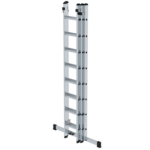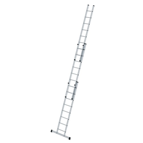 Die stabile zweiteilige Schiebeleiter für den professionellen Einsatz.- Stabile holmumgreifende Aluminium-Führungsprofile für eine hoheStabilität- Automatisch einrastende Sperrhebel (AutoSnap-System) für einensicheren Transport- Holme aus stabilem Alu-Pressprofil mit Kantenverstärkung- Rutschhemmende, rundum profilierte 30 mm tiefe Sprossen für einensicheren Stand.- Leiternteile auch einzeln verwendbar- Rutschhemmende Fußstopfen (SafetyCap)- Ab der Ausführung 2x12 Sprossen ist das Schiebeteil mit der neuenTrigon-Traverse ausgestattet.