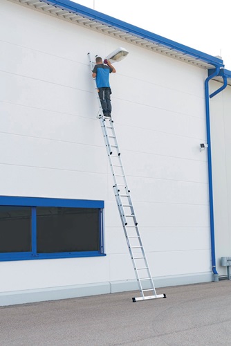 2-teilig aus Aluminium · stabile Rechteckrohr-Holme · 80 mm tiefe Stufen mit Trittauflage clip-step R13 für zertifizierte Rutschhemmung · 4-fach gebördelte Stufen-/Holmverbindung · einfache Höhenverstellung und sicherere Arretierung von vorne durch seitliche korrosionsbeständige Steckbeschläge · extra breite Standfläche von 170 mm Tiefe im Überlappungsbereich der Unter- und Oberleiter · Oberleiter mit Leiterkopfsicherung (Klettband) zur Befestigung an Dachrinnen o.ä. · Unterleiter mit nivello®-Traverse für einen extra sicheren Stand und Aufstieg · Oberleiter mit nivello® Leiterschuhen, da zur Einzelnutzung entnehmbar · max. Gesamtbelastung 150 kg Die nivello®-Traverse liegt lose bei und wird zweifach am unteren Holmende verschraubt. Die Trittauflage wird bis zur maximal begehbaren Stufe aufgebracht.