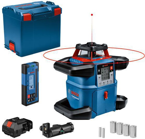 Rotationslaser GRL 600 CHV · Stabil · baustellensicher - der robuste GRL 600 CHV Professional bewährt sich auch unter härtesten Bedingungen. Seine stabile Bauweise macht ihn stoßfest und bietet gemäß IP68 Schutz gegen Staub und Wasser (einschließlich Batteriefach) für äußerst flexibles Arbeiten trotz schlechten Wetters. Er bietet praktische Konnektivität und gewährleistet so fokussierteres Arbeiten mit weniger Zeitverschwendung. Dank seines Bildschirms und des Zugangs zur Levelling Remote App · die alle Funktionen · einschließlich der Zweifach-Neigungseinstellung · visualisiert und damit wertvolle Zeit spart · ist die Bedienung des Geräts intuitiv. Dieser hochpräzise Laser bietet sowohl mit dem 18V-Akkusystem als auch mit den beigelegten Alkali-Batterien lange Betriebszeit für unterbrechungsfreies Arbeiten. Dieses Werkzeug ist konzipiert für Außenanwendungen · bei denen es um Aushub- · Betonier- · Gartenbau- und Fassadenarbeiten geht. Der GRL 600 CHV bietet außerdem einen hochwertigen Empfänger mit 125 mm Empfangsfläche · zweiseitigem Display und einer Versatzfunktion in Millimeter. Das Kalibrieren des Werkzeugs erfolgt schnell und einfach entsprechend den schrittweisen Anweisungen in der intuitiven App - das spart Zeit und Ressourcen und garantiert bei jeder Arbeit exakte Resultate. Mit dem in der App verfügbaren praktischen „Maskenmodus“ können Reflexionen und Interferenzen mit anderen Geräten auf der Baustelle vermieden werden. Laser-Empfänger LR 60 Professional (0 601 069 P00). Empfängerhalterung RB 60 Professional. Akku-Adapter BA 1 Professional. 4 x Batterie LR20 1,5V (D). 2 x 1,5 V LR6-Batterie (AA). L-BOXX 374 (1 600 A01 2G3) Weitere technische Eigenschaften: · Stromversorgung: 18V-Li-Ion-Akku, 4 x D-Batterien · Schutzart: IP 68 · Betriebsdauer: 60 h, 70 h · Akkuspannung: 18V · Arbeitsbereich ohne Empfänger: 60 (Durchmesser)m · Gewicht mit 4,0Ah-Akku: 4,3kg · Gewicht mit Alkalinebatterien: 4,6kg · Kompatible Laser-Empfänger: LR 60 · Lagertemperatur: -20 - 50Grad Celsius · Projektion: 1 x 360° Linie · Stativ-Gewinde: 2 x 5/8Zoll