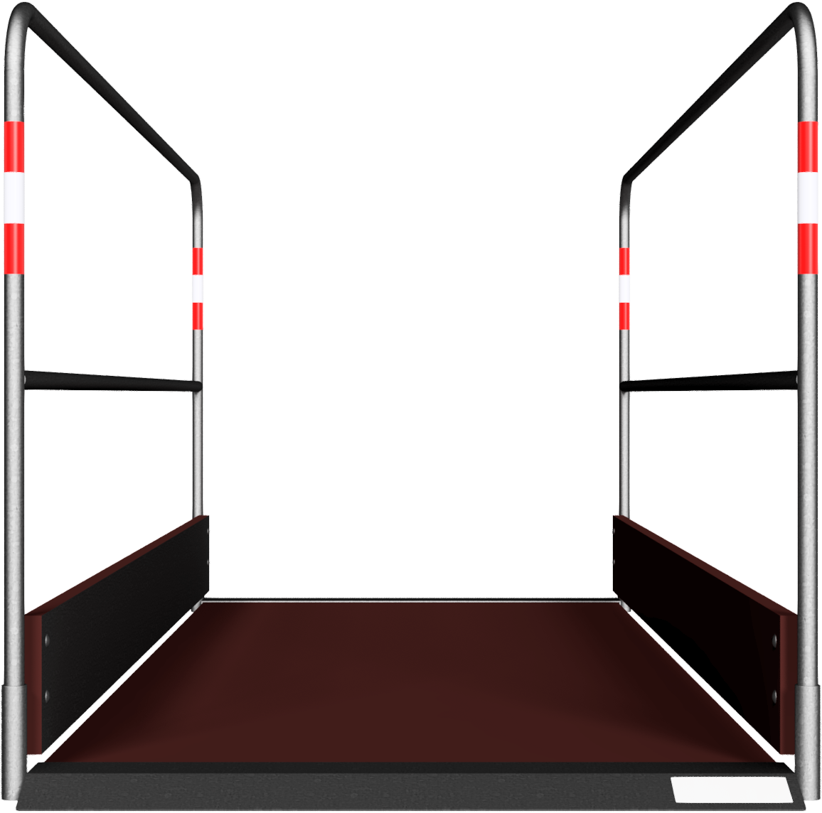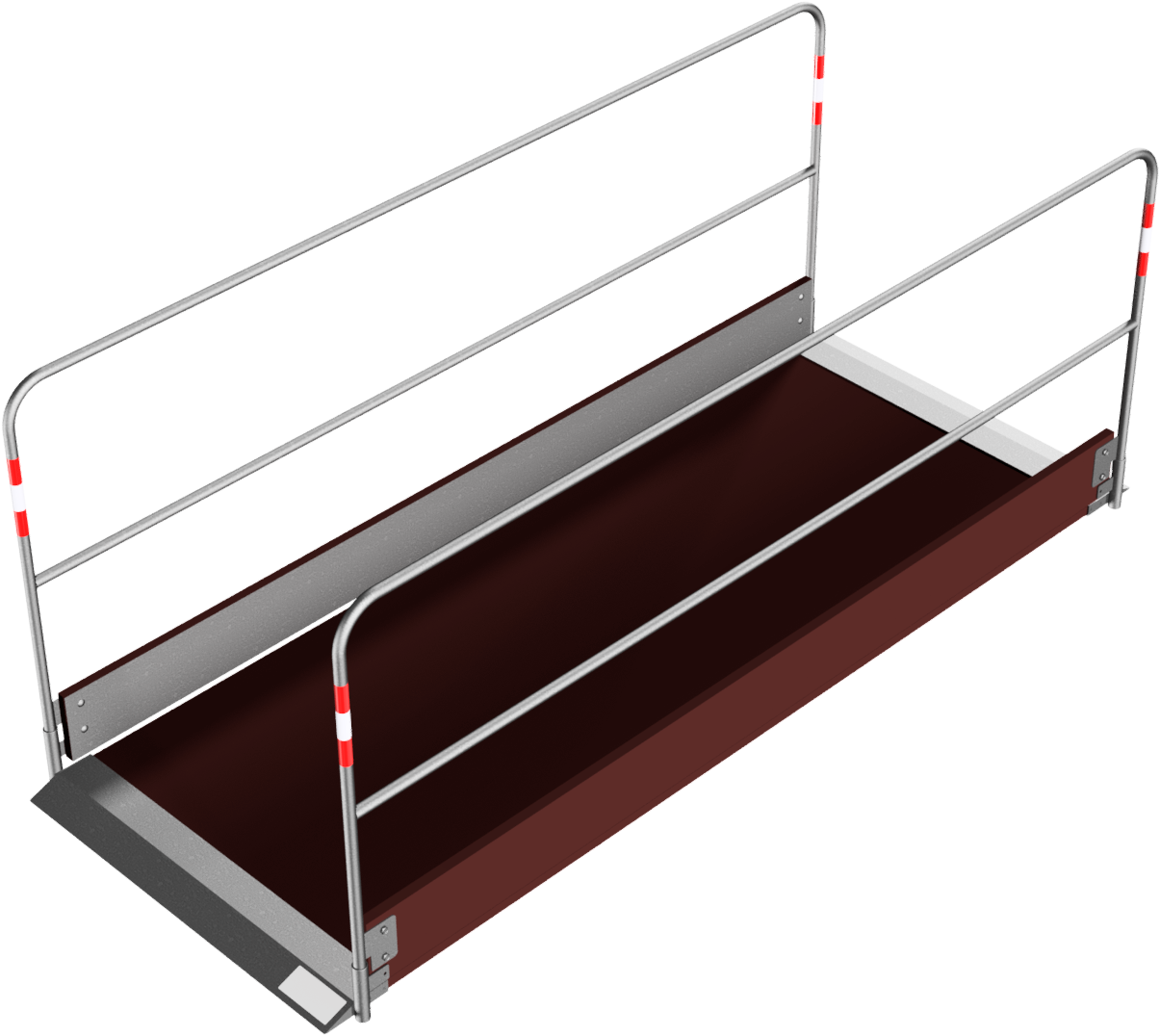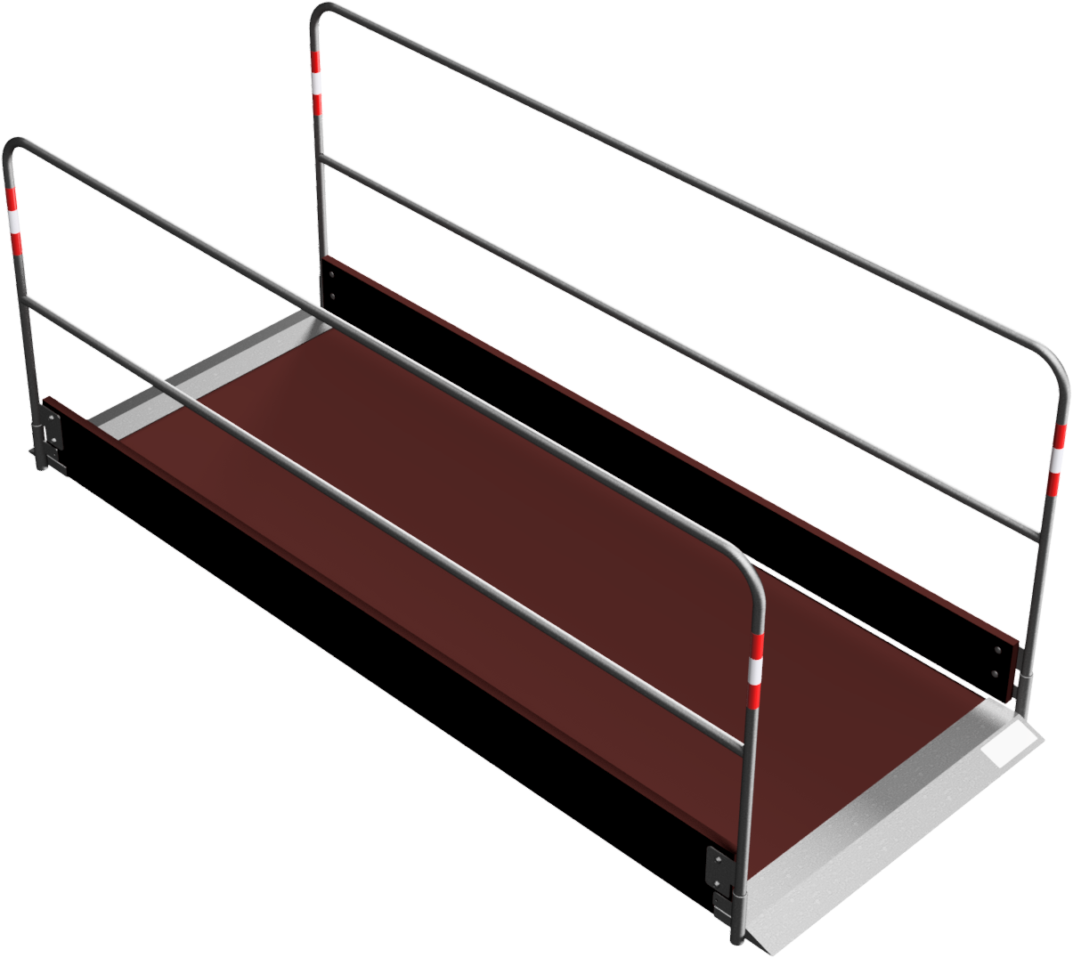 Grabenbrücke Kunststoff 1,70 m lang, 1,00 m, Nutzfläche aus rutschfestem Kunststoff, mit seitlich einsteckbaren Geländern aus verzinktem Stahl. Mit Tragegriff und Tastleiste die Geländer sind mit rot-weiß-roten Reflektorstreifen ausgestattet. Diese Grabenbrücken entsprechen der Arbeitsstätten- und ZTV-SA, Tragfähigkeit: 1000 kg