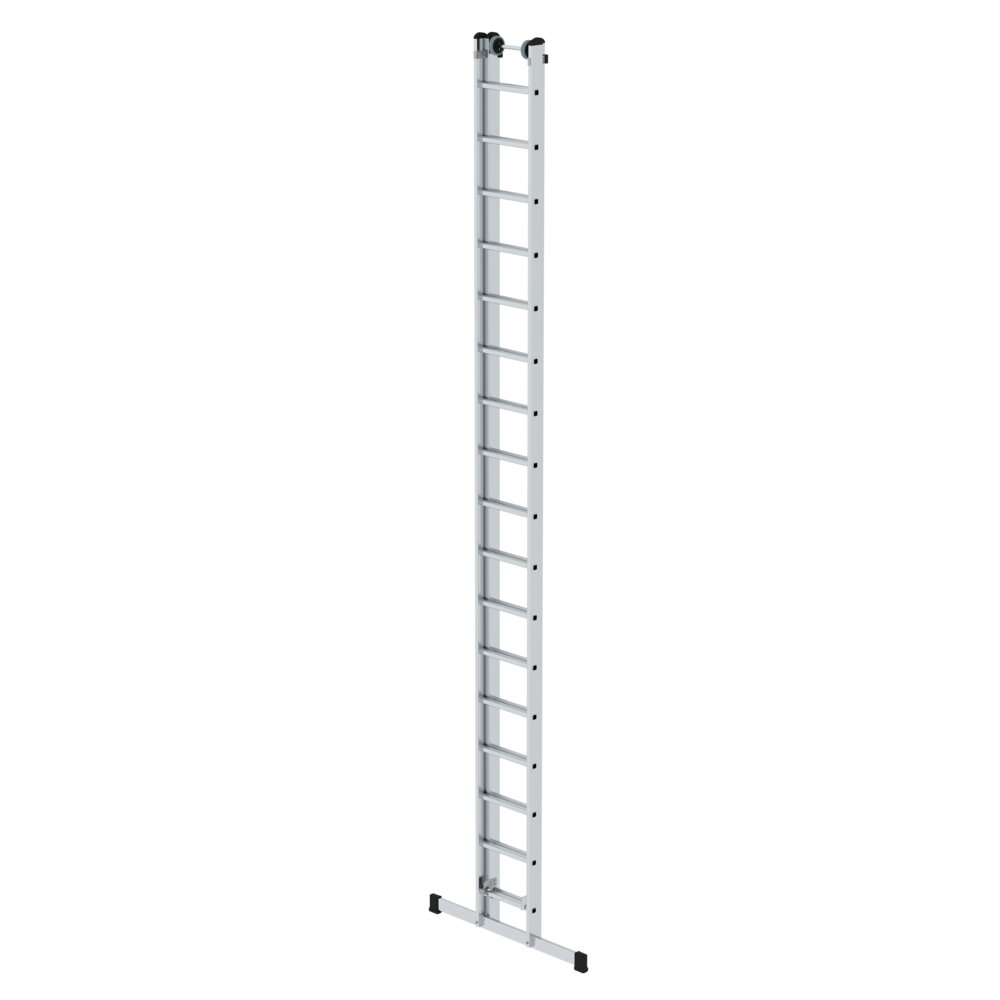 Sprossen-Schiebeleiter aus Aluminium Stabile Rechteckrohr-Holme Beidseitig geriffelte Vierkantsprossen 30 x 30 mm 4-fach gebördelte Sprossen-/Holmverbindung Einfache Höhenverstellung von Sprosse zu Sprosse dank Steckhaken mit automatisch einrastender Abhebesicherung Oberleiter ab Größe 2 x 14 Sprossen mit Wandlaufrollen Korrosionsbeständige Führungsbeschläge Oberleitern bis 3,0 m mit nivello® Leiterschuhen Sprossenabstand: 280 mm Leiterbreite: 420 mm (ohne Traverse) Maximale Belastung: 150 kg Standard-Traverse mit rutschsicheren Leiterschuhen in optimaler Breite zum gewählten Produkt für einen sicheren Stand und Aufstieg bei Anlegeleitern über 3,0 m. Die Traverse liegt lose bei und wird zweifach am unteren Holmende verschraubt Hinweis: Nach Norm ist das aufgesetzte Schiebeleiterteil bei Längen über 3,0 m nicht von der Leiter trennbar