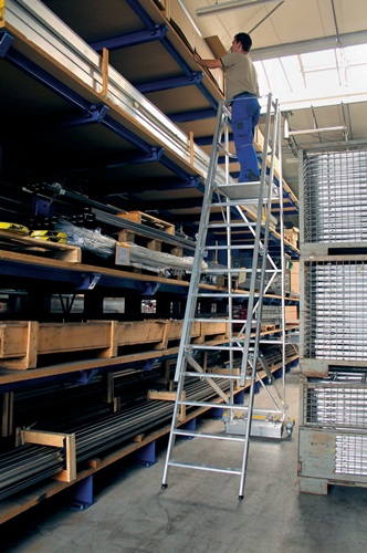 Plattformleiter aus Aluminium Stabile Rechteckrohr-Holme 80 mm tiefe · geriffelte Stufen Geräumige Plattform mit Riffelung für sicheren Stand (650 x 600 mm) 4-fach gebördelte Stufen-/Holmverbindung Mit beidseitigem Handlauf · 3-seitigem Geländer sowie Knie- und Fußleisten für ein sicheres Begehen und Stehen Stützteil mit schmalem Fahrwerk und Ballastgewicht für hohe Standsicherheit Dank stabiler Stahl-Scharniere platzsparend zusammenklappbar (wenn Ballastgewicht außen) Besonders für enge Regalgänge o.ä. geeignet Integrierte Bockrollen Ø125 mm mit Feststeller für einen schnellen Standortwechsel im ausgeklappten Zustand nivello®-Leiterschuhe mit patentierter 2-Achsen-Neigungstechnik Großzügige Werkzeugablageschale Außenbreite: 650 mm (ohne Traverse) Stufenabstand: 235 mm Leiterneigung: 70° Maximale Belastung: 150 kg Breite 650 mm, Gesamt-Länge geklappt 4000 mm