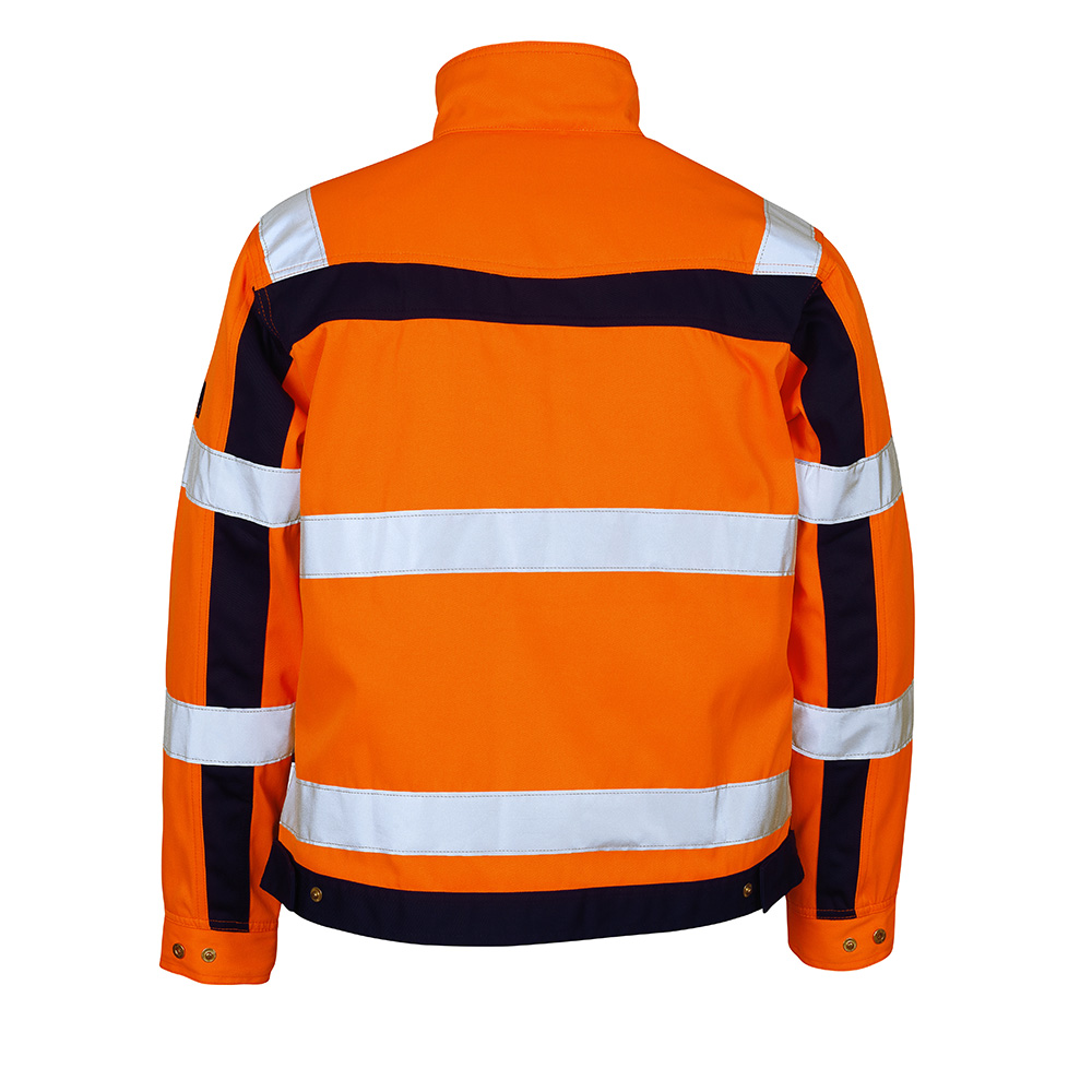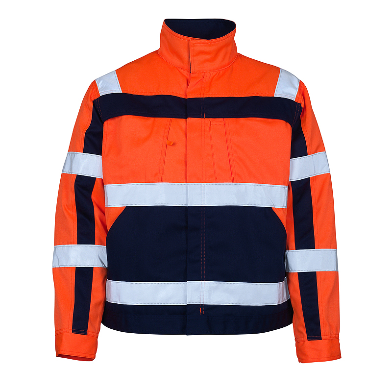 Bequeme Warnschutzjacke aus Stretchstoff mit körperbetonten Schnitt, verstärktem Stoff und Reflexelementen. Material: 50% Polyester/50% Baumwolle, 270 g/m². Produkteigenschaften: 2 Brusttaschen, 2 Seitentaschen, 2 Innentaschen, Oberamtasche, Frontreißverschluss mit kombiniertem Kinn-und Bartschoner sowie Windschutzblende, Steh-/Umlegekragen, Schulter mit Stretcheinsatz, weitenregulierbar Ärmel mit innenliegendem Strickbündchen, verlängerter Rücken. Reflex-Elemente: Segmentiertes und durchgehendes Reflexband kombiniert, 2 Reflexstreifen an Rumpf und Ärmel umlaufend (5cm breit), zusätzliche Reflexstreifen über Schulter sowie an Brust und oberem Rücken (5cm breit) und am Oberarm (2,5cm breit). Norm: EN ISO 20471 Kl. 2.